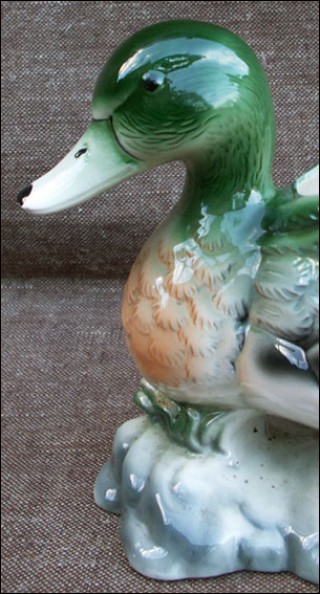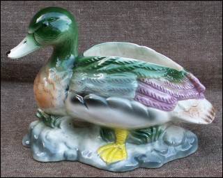 Petite jardinière canard en barbotine de FFAS, milieu XXème siècle. Très bel état. Signée sur son fond et le C de copyright. Hauteur 13,5 cm, largeur 22,5 cm.