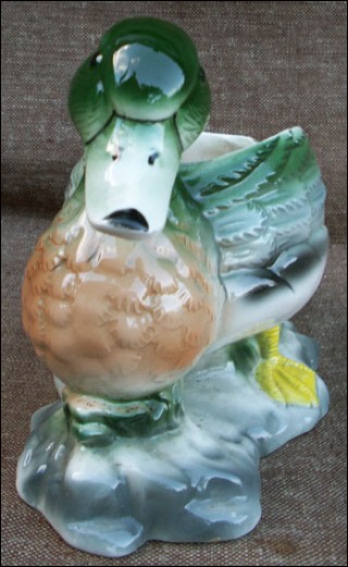 Vintage samll jadiniere or vase duck shaped in majolica made FFAS. Perfect condition. It's stamped on the back.8 7/8" width 5 3/8" high.