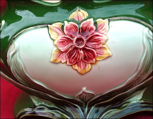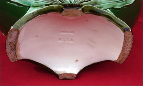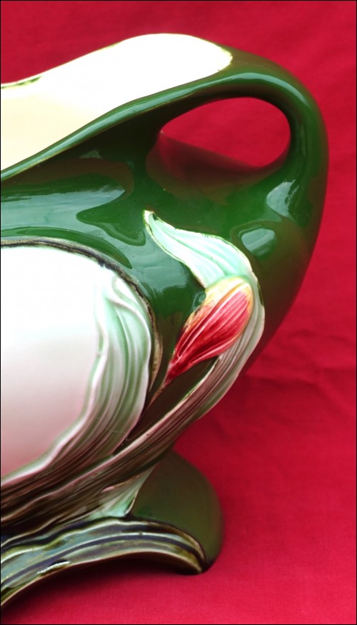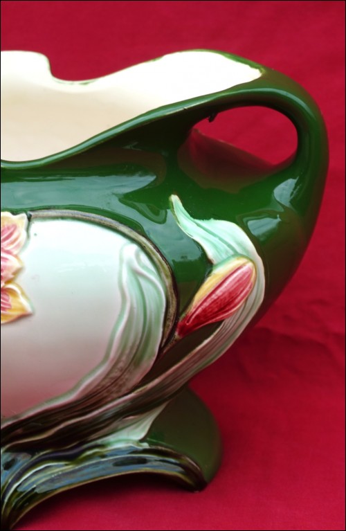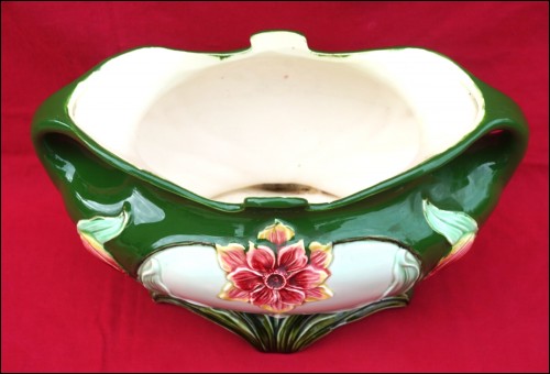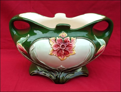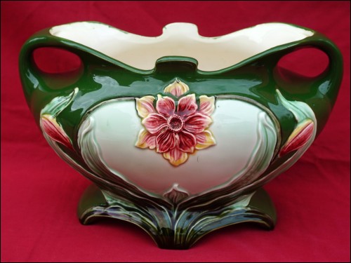 Antique Art Nouveau jardiniere vase in majolica made by Eichwald during the 1900's. It's signed and numbered 5854 on the back. 10 1/2" (26.5cm) length, 6 1/2" ( 16.5cm) width, 6 1/4" (16cm) height. Perfect condition as shown by the following pictures.