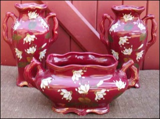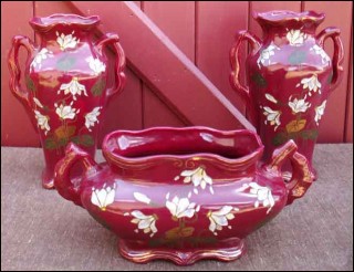 Center mantel 3 pieces set in french majolica made by the famous Luneville factory during the 1900's Art Nouveau period. The hand painted decor shows waterlily and japane leaves on buirgundy background with great colors of enamels surrounded by a gilt border. Good condition only one handle of the jardiniere has been repair. 11 1/4" high for the vase.