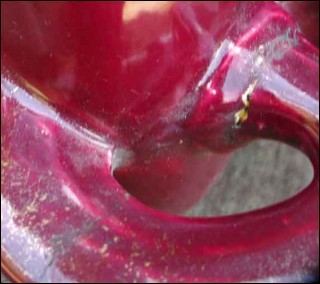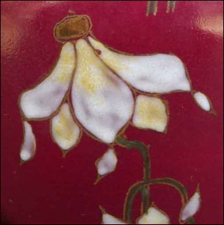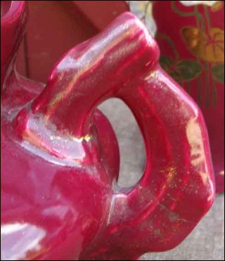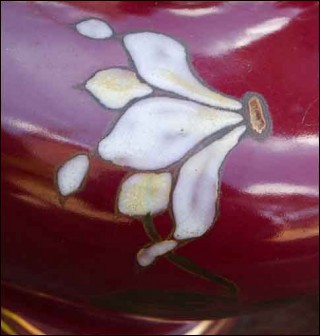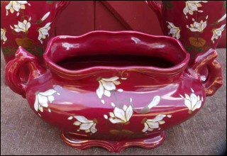 Garniture en barbotine, composée d"une jardinière et de ses deux vases d'accompagnement, manufacture de Lunéville, Art Nouveau 1900. L'ensemble sur fond grenat est au décor de nénuphars, les fleurs sont en émaux nacrés sur des feuilles d'inspiration japonisante, le tout surligné de filet or. Bon état, une anse de la jardinière recollée. Hauteur des vases 28,5 cm.