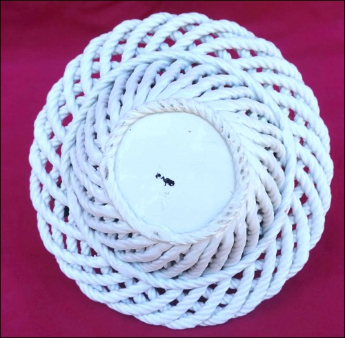 Panier de fruit en trompe l'oeil, majolique italienne milieu XX° siècle. Signé sur son fond. Diamètre 18cm, hauteur 10.2cm. Parfait état, un défaut de cuisson voir dernières photos.