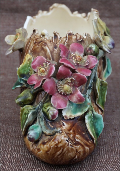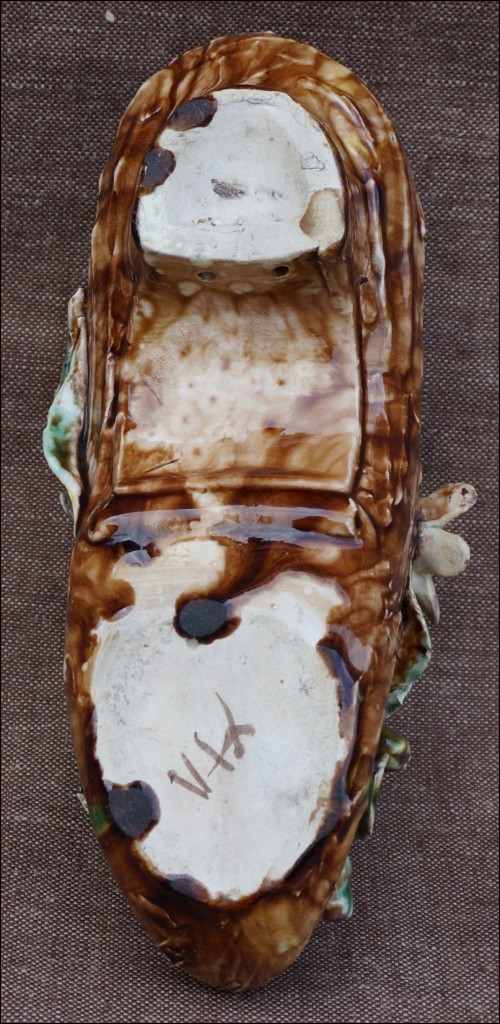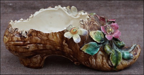 French Impressionist barbotine majolica ladies shoe vase made probably by Longchamp during the 1880's. The hand worked barbotine shows flowers and leaves as an impressionnist painting. Good condition with just a few chips on the edge as you can see on the pictures below. 9 1/4" length 4 1/8" high 3 1/2" width.