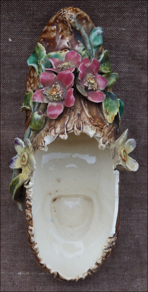 Soulier de Dame en barbotine impressionniste vers 1880, peut être manufacture de Longchamp. Il est richement orné de fleurs. Bon état, plusieurs égrenures sur le bord. Longueur 23,5 cm, largeur 9,5 cm hauteur 9 cm.