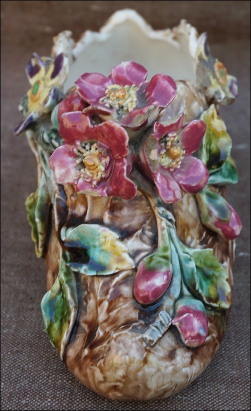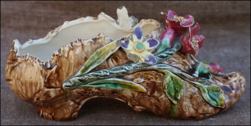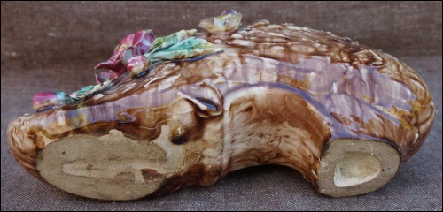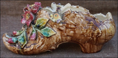 French Impressionist barbotine majolica ladies shoe vase made probably by Longchamp during the 1880's. The hand worked barbotine shows flowers and leaves as an impressionnist painting. The shoe is numbered 1319 on the back and has two holes for hanging. Perfect condition with just a few minor chips on the flowers as you can see on the pictures below. 8 7/8" length 4 1/8" high 3 3/4" width.