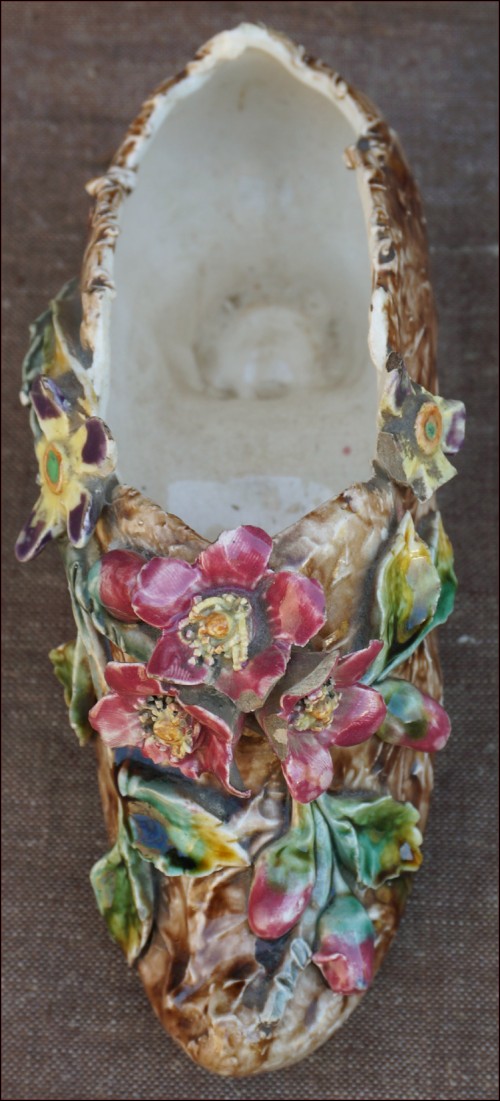 Soulier de Dame en barbotine impressionniste vers 1880, peut être manufacture de Longchamp. Il est richement orné de fleurs. Bel état, plusieurs pétales cassées. Numéro de forme 1319. Longueur 22,6 cm, largeur 9,5 cm hauteur 10,5 cm.