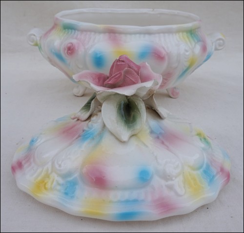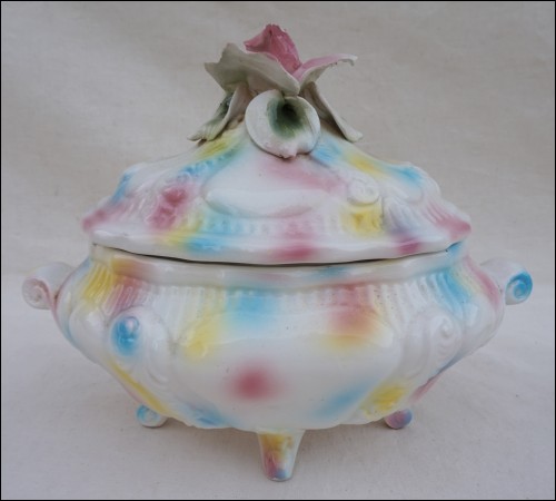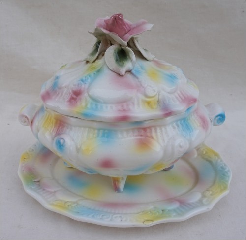 Vintage Italian majolica lidded tureen with platter made during the 1970's. It's signed on the back MAde in Italy. 11 3/4" (30cm) width 9 1/2" (24cm) height. Good condition a chip glued on the edge of the platter and tiny chips on the end the rose petals as presented on the following pictures.