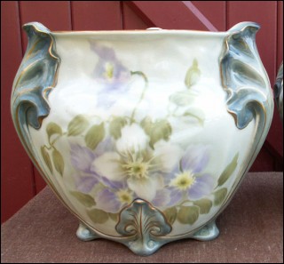 Paire de grand cache pots en barbotine décor clématite époque Art Nouveau, vers 1900. Manufacture de Keller et Guérin à Lunéville, rehaussés d'un filet d'or, ils sont en très bel état. Hauteur 30 cm, diamètre 30 cm.