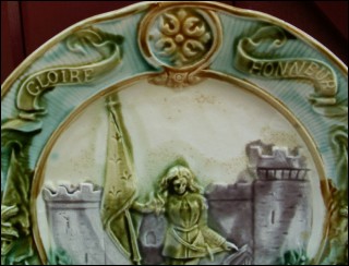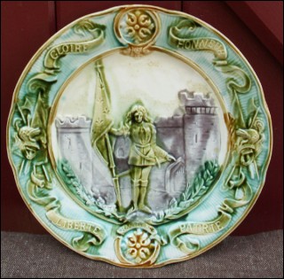 Jeanne d'Arc comemorative plate in french majolica made by the Sarrefuemines factory during the 1890's. The hand enameld pattern in relief shows Jeanne d'arc with her Montjoie standard. Good condition. 8 1/2" diameter.