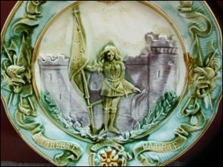 Assiette en barbotine d'Onnaing ou Sarreguemines pour honoré Jeanne d'arc, vers 1890. Au centre Jeanne en armure et son étendard " Montjoie". Bel l'état. Diamètre 21,5 cm.