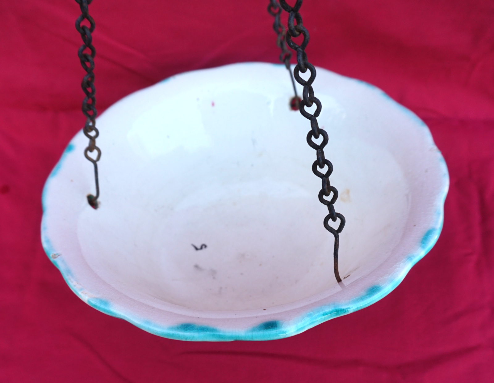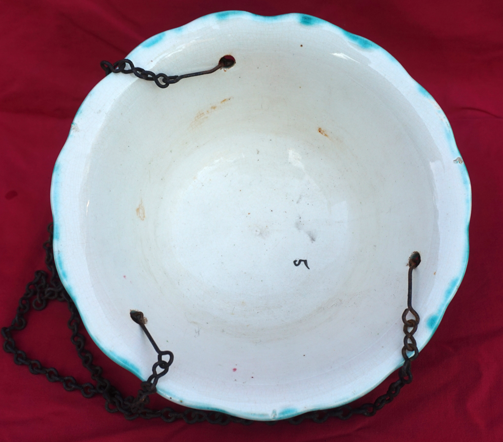 Suspension en barbotine à décor florale manufacture d'Orchies vers 1900's. Numérotée à l'intérieur. Diamètre 25cm, hauteur de la jardinière 13.5cm, hauteur totale avec les chaines 56cm. Parfait état.