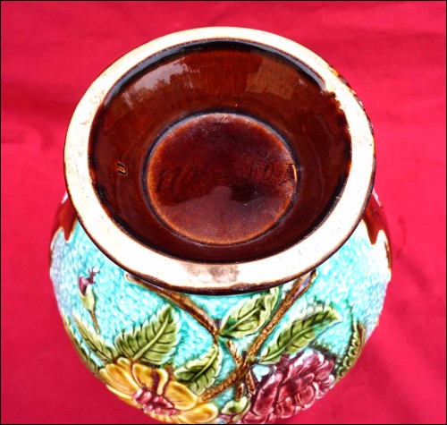 French majolica flower pot jardiniere made by Gustave De Bruyn late 19th century. It's stamped and signed on the back. 8 1/4" (21cm) height,7 1/4" (18.5cm) fiameter to the top. Perfect condition as shown by the following pictures.