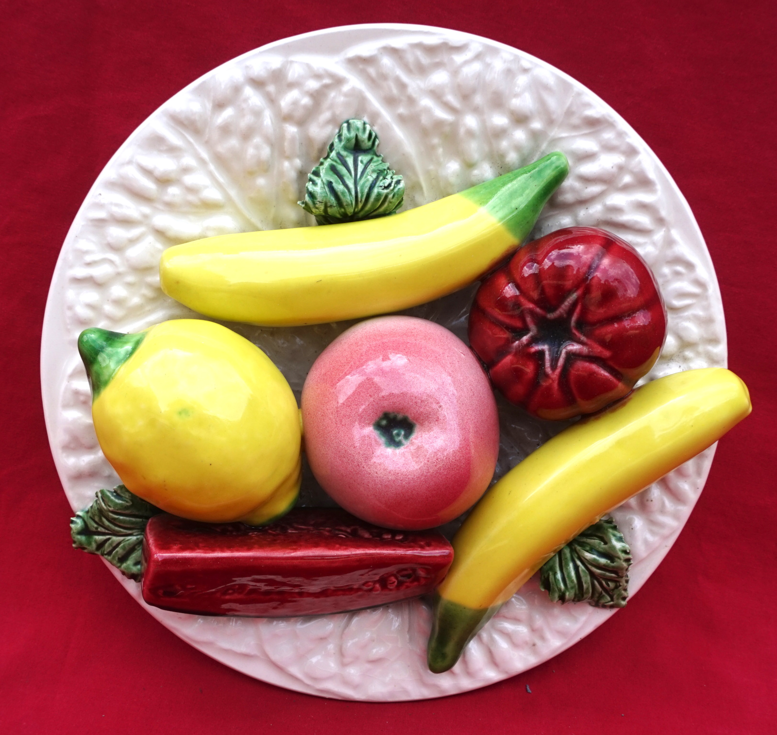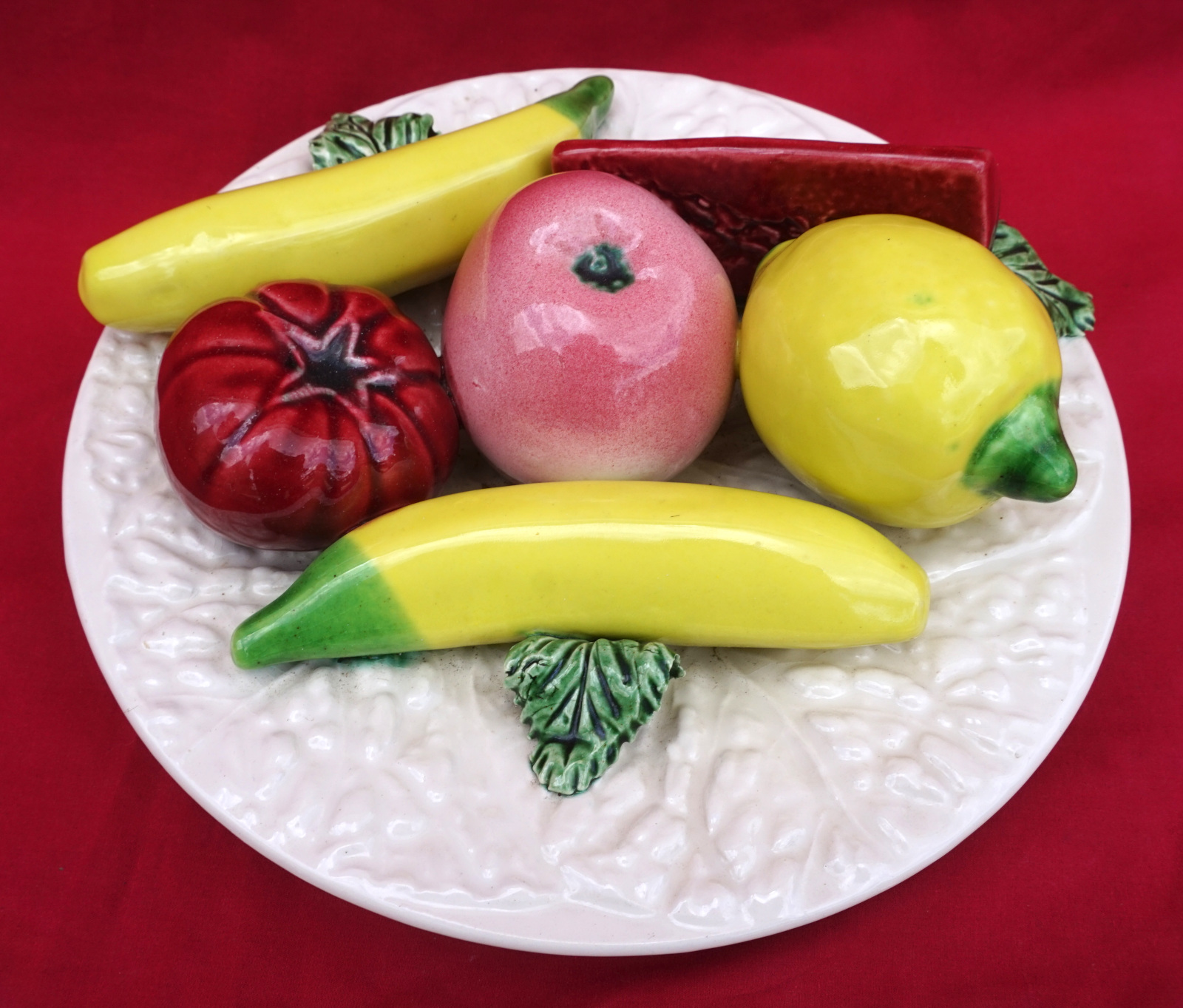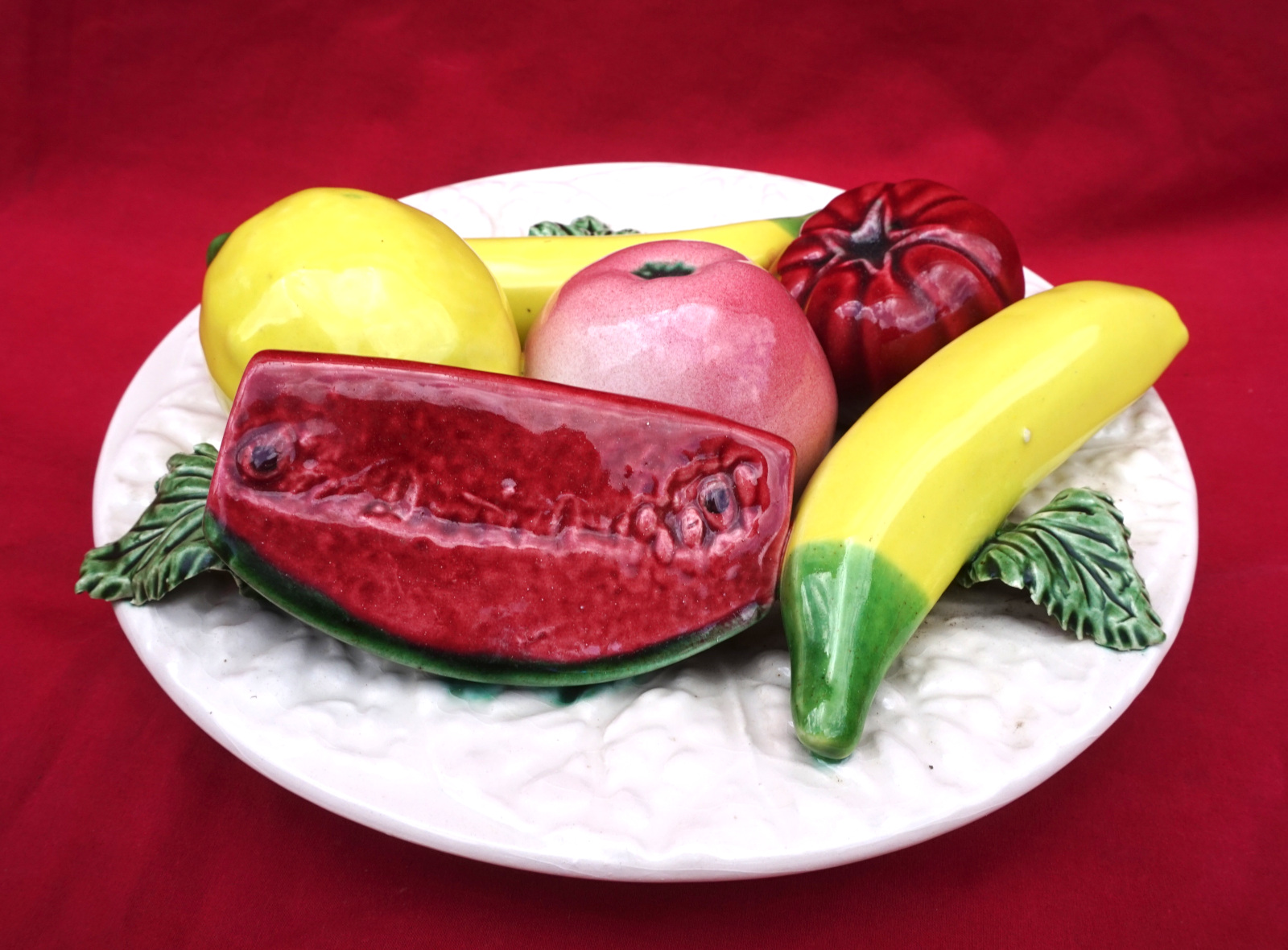 French majolica trompe loeil plate with fruit, banana, pomegranate, apple, watermelon made during the 1960's. 9 3/4" (24.8cm) diametern 3 1/8" (8cm) depth. Perfect condition with 2 holes for hanging