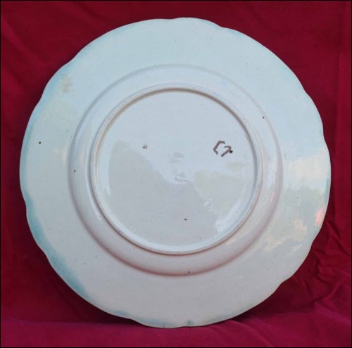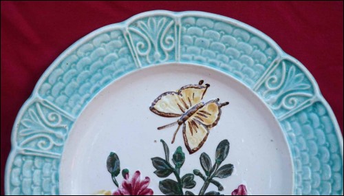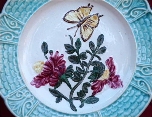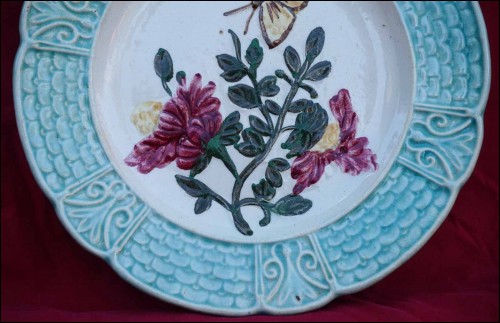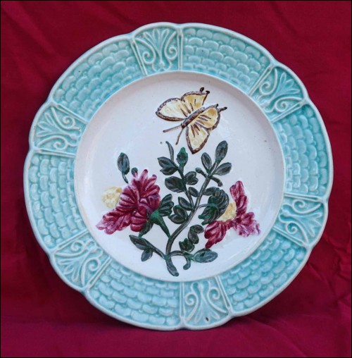 French majolica with relief plate showing butterfly and flowers made by Orchies during the 1900's Art Nouveau area. It's signed on the back. 8 1/2" (21.5cm) diameter. Perfect condition as shown by the following pictures.