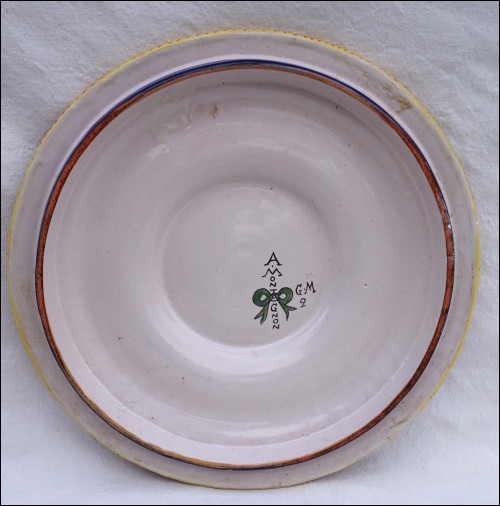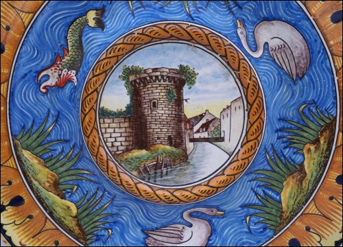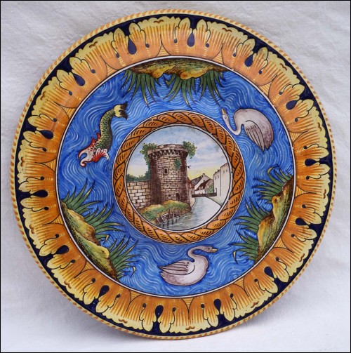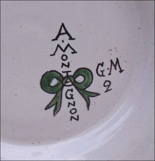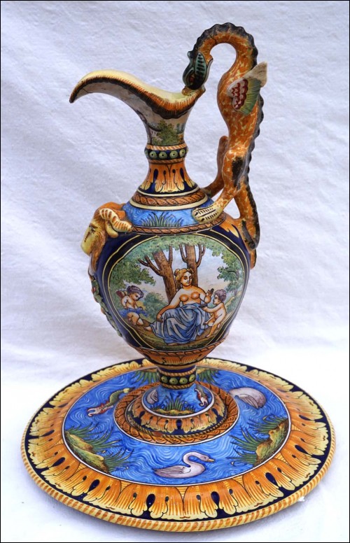 Large ewer with tray in hand painted french faience made by Albert Montagnon in Nevers during the 1900's. The ewer or aiguiere has a chimera shaped handle and a head of ram in front. The hand painted decor shows cityscape and cherubs in landscape. They are signed on the back with the green knot and A Montagnon. 15 5/8" (39cm) height for the ewer and 12 3/4" (32,5cm) diameter for the tray.Good condition the chimera handle and the lip of the ewer, the tray is in perfect condition, as shown by the following pictures.