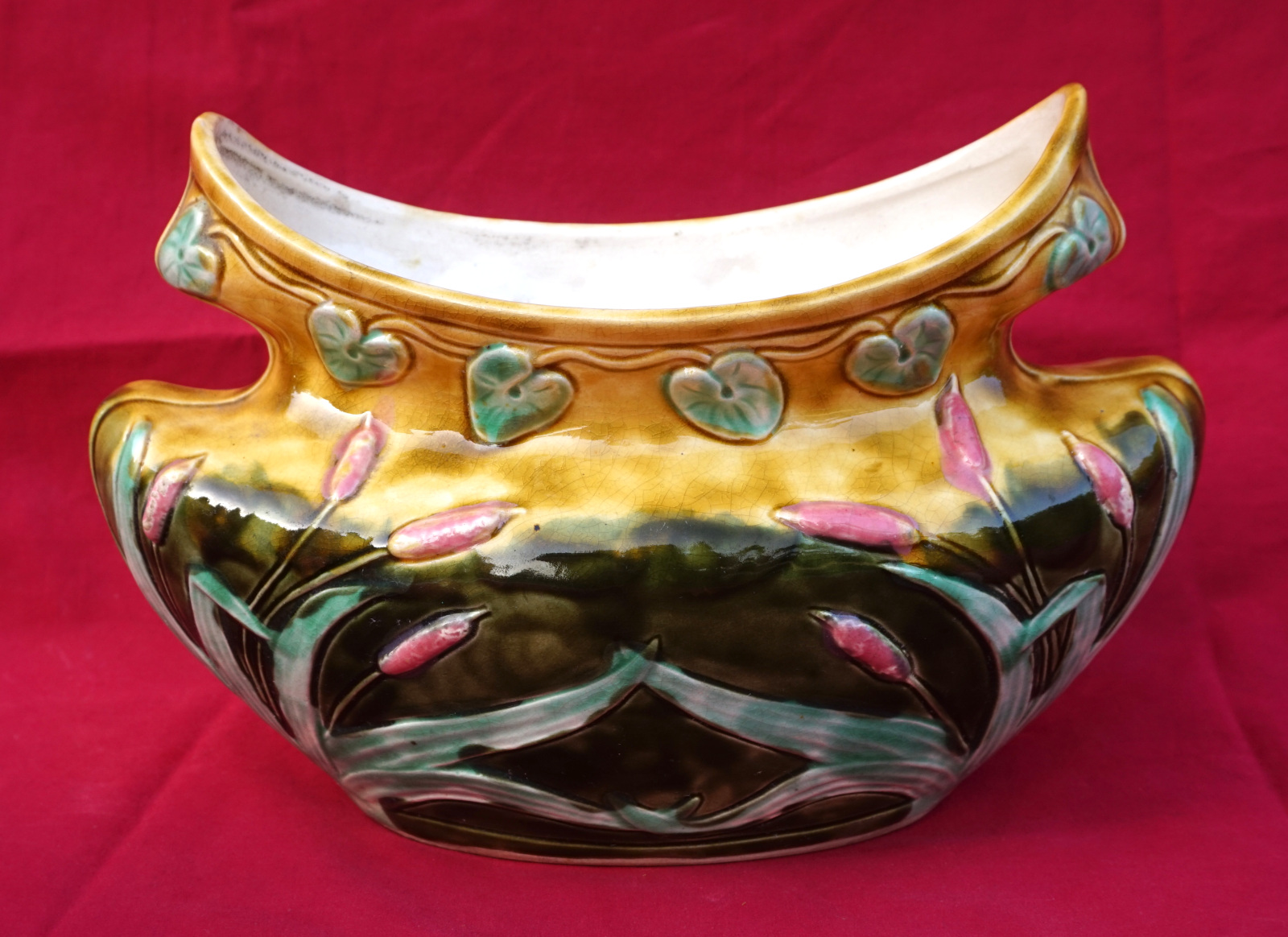 French Art Nouveau jardiniere vase inn majolica with reeds decor made by Sarreguemines during the 1900's. Art Nouveau area. It's numbered on the back 370. 6 1/2" (16.5cm) height, 10" (25.5cm) width, 4 3/4" (12cm) depth. Beautiful condition, no chips or cracks or hairlines, as shown by the following pictures.
