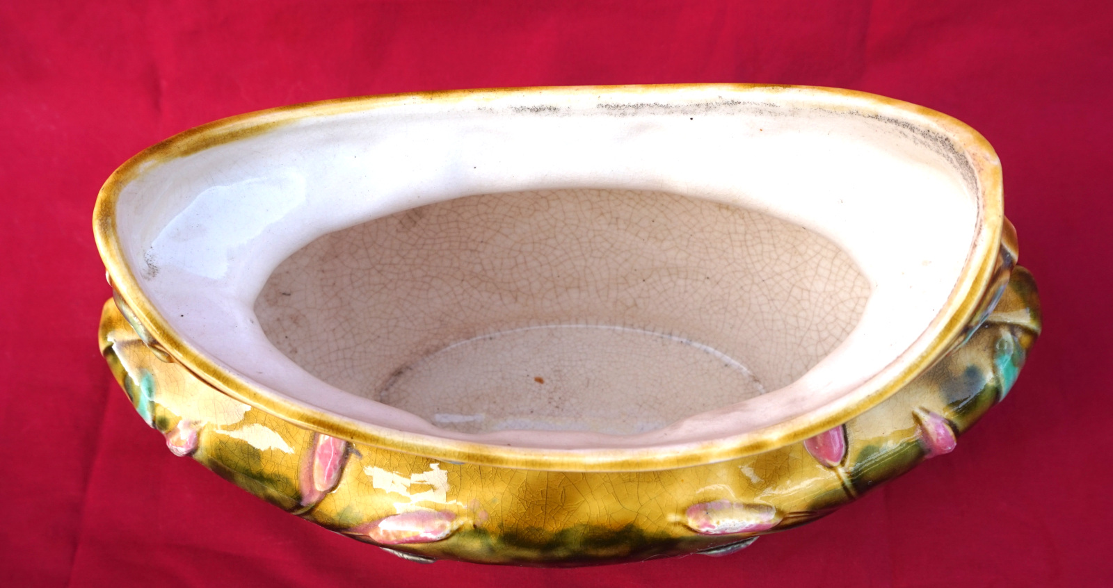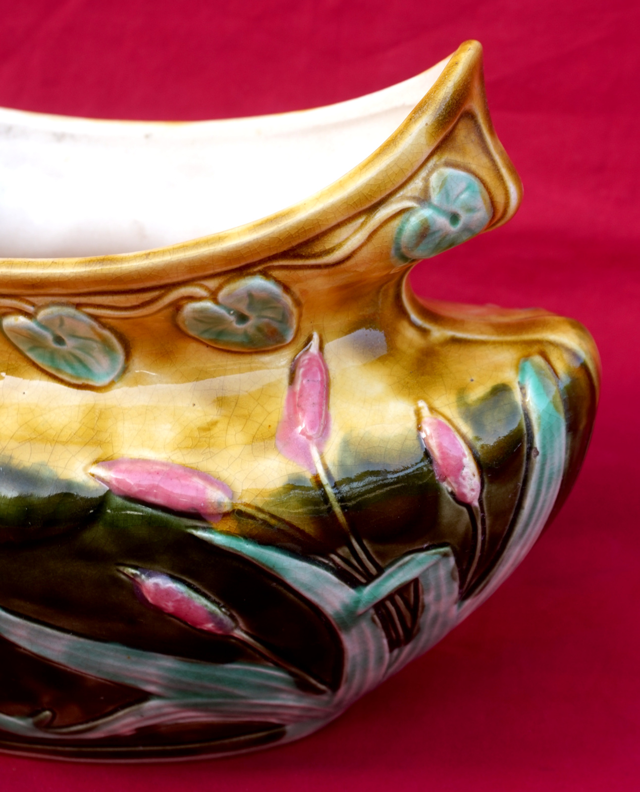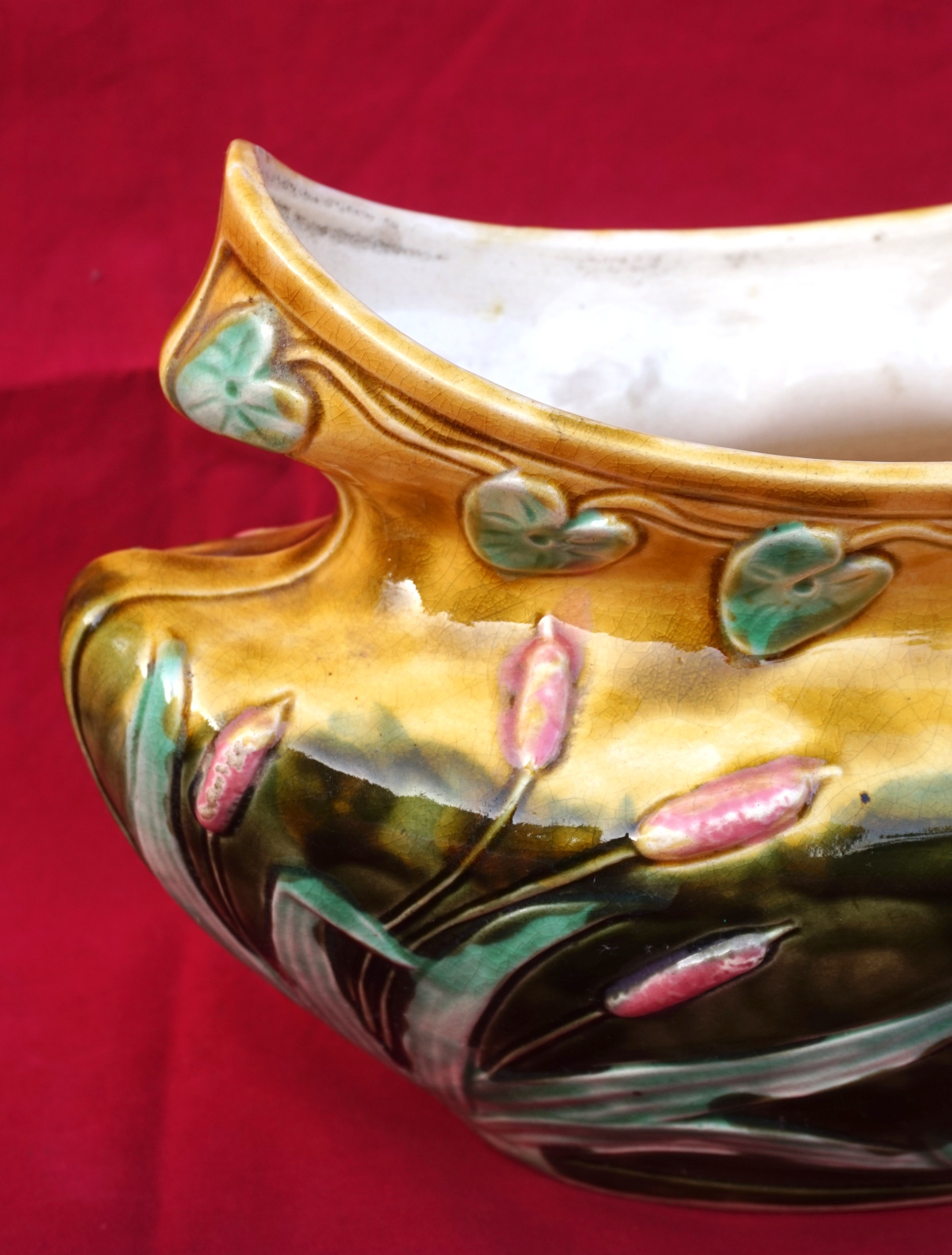 Jardinière en faience de Sarreguemines à décor de roseaux, vers 1900. Hauteur 16.5 cm, longueur 25.5 cm, largeur 12 cm. Elle est numérotée 310 sur son fond. Très bel état.