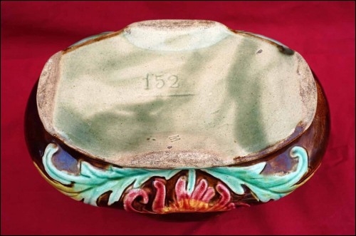 Jardinière en barbotine à décor de fleurs par Sarreguemines vers 1900. Elle est numérotée et signé sur son fond. Longueur 28cm, largeur 16.5 cm, hauteur 12.8 cm. Parfait état.