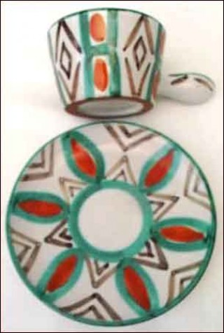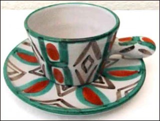 Vintage coffee cup in French majolica made by Hyevre in Vallauris around 1970.The geometric pattern is hand painting. Good condition. 5"1/2 diameter for the saucer 3"3/8 for the cup without handle 2"3/4 high overall.