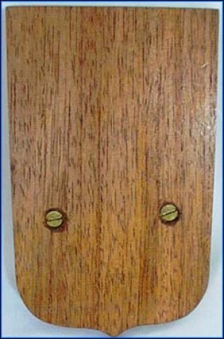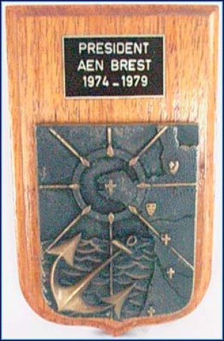 Ecusson aux armes de l'Ecole Naval de Brest pour le Président de l'A.E.N. (association des anciens élève de l'école navale), appelé "Tape de Bouche" en souvenir du bouchon plat de liège ou de bois tourné, employé pour fermer la bouche d'une pièce d'artillerie et empêcher l'eau de pénétrer son âme. Né en 1974, il est en bronze sur bois exotique. Hauteur 19 cm, largeur 11,5 cm.