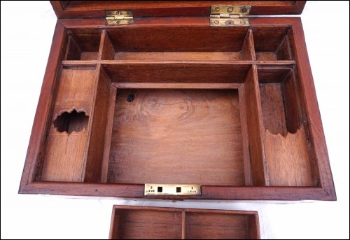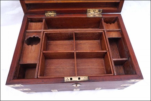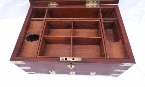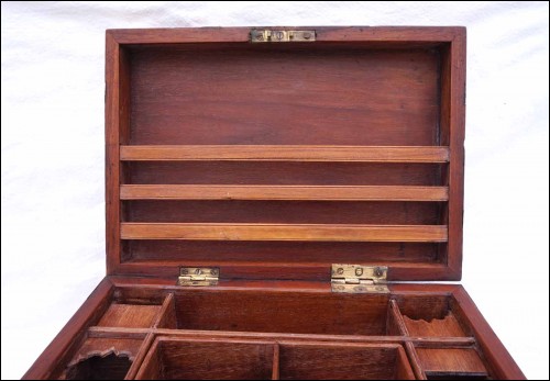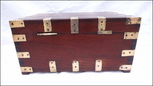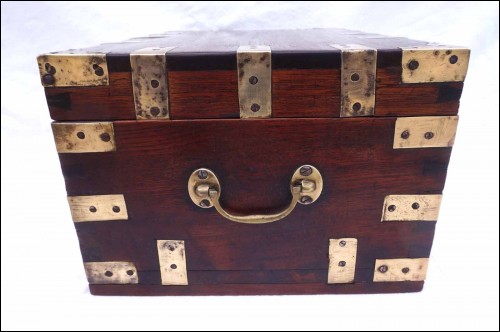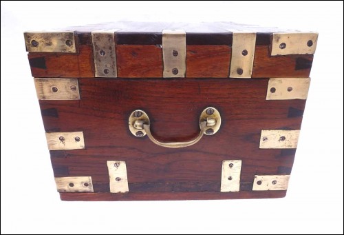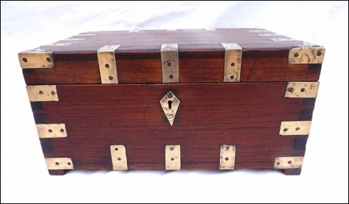 Coffret de capitaine en bois de teck, époque des colonies britanniques des Indes, Raj britannique, fin XIXe. Elle servait au règlement de la solde de l'équipage. Longueur 35.5 cm, largeur 25 cm, hauteur 17.8 cm, poids 4.349 kg. Bel état, la clef n'est pas d'origine et la serrure a réviser.
