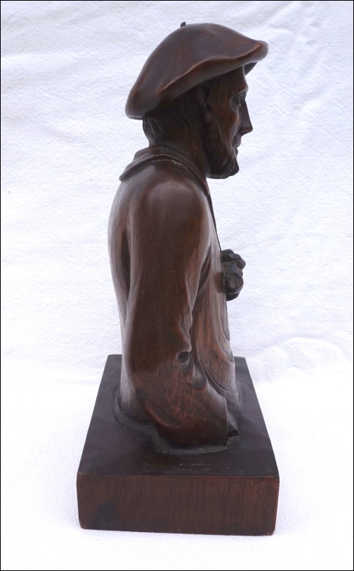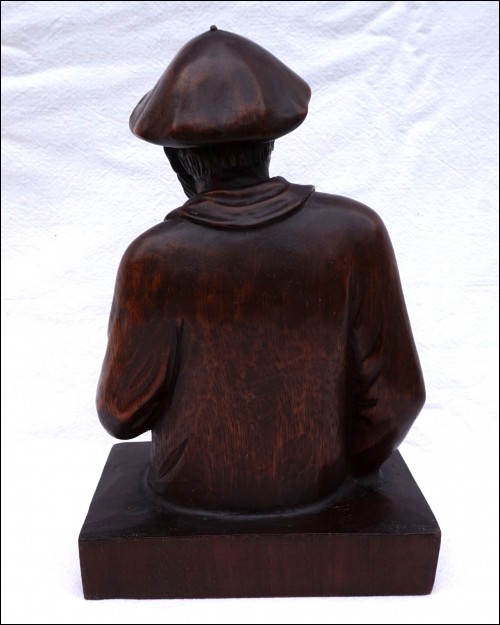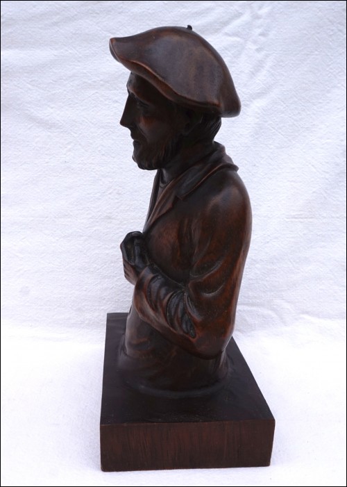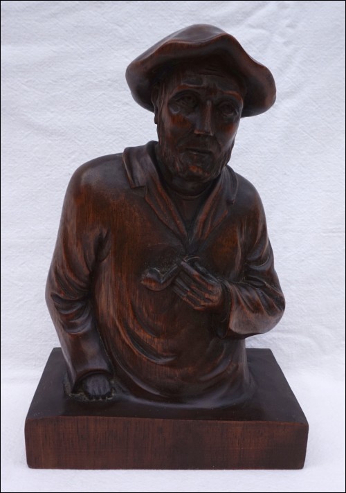 Sculpture sur bois exotique de Pierre Cariou Morbihan. Terre-neuvas en buste, pêcheur de morue breton dans les eaux de l'archipel de Saint-Pierre-et-Miquelon, au large du Canada, situé à proximité immédiate des bancs, dont le port de Saint-Pierre servait de port de relâche et d'approvisionnement aux navires de pêche. Hauteur 25cm, largeur 16.3cm, profondeur 10cm.