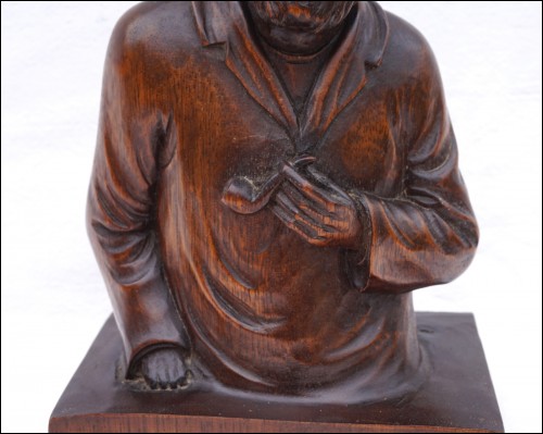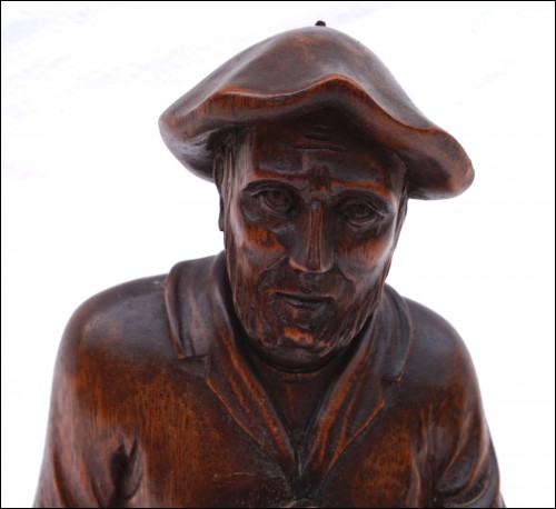 French Breton hand carved wood figure fisherman smoking pipe made by Pierre Cariou near Quimper Brittany during the mid-century. 9 7/8" (25cm) height, 6 1/2" (16.3cm) width, 3 7/8" (10cm) depth. Perfect condition with beautiful patina as shown by the following pictures.