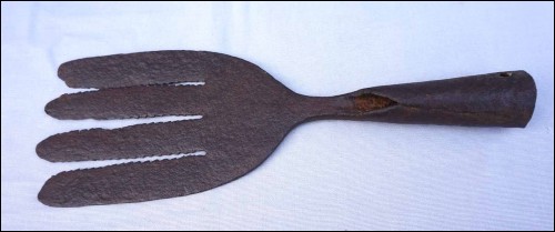French hand forged wrought iron eel fork fishing tool made early 18th century. 17" (43cm) length, 10" (15.2cm) width, weight 2lb 9.51oz (1.177 kilogram). Beautiful condition and patina as shown by the following pictures.