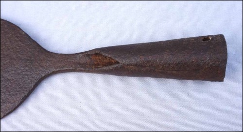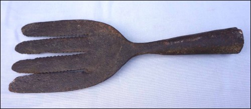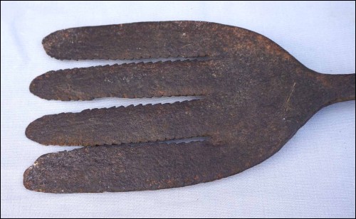 Foëne à anguilles à lames dentelées en fer forgé du début du XVIIIème siècle. Bel état d'usage. Longueur totale 4 cm, largeur 15.2 cm, poids 1.177kg.