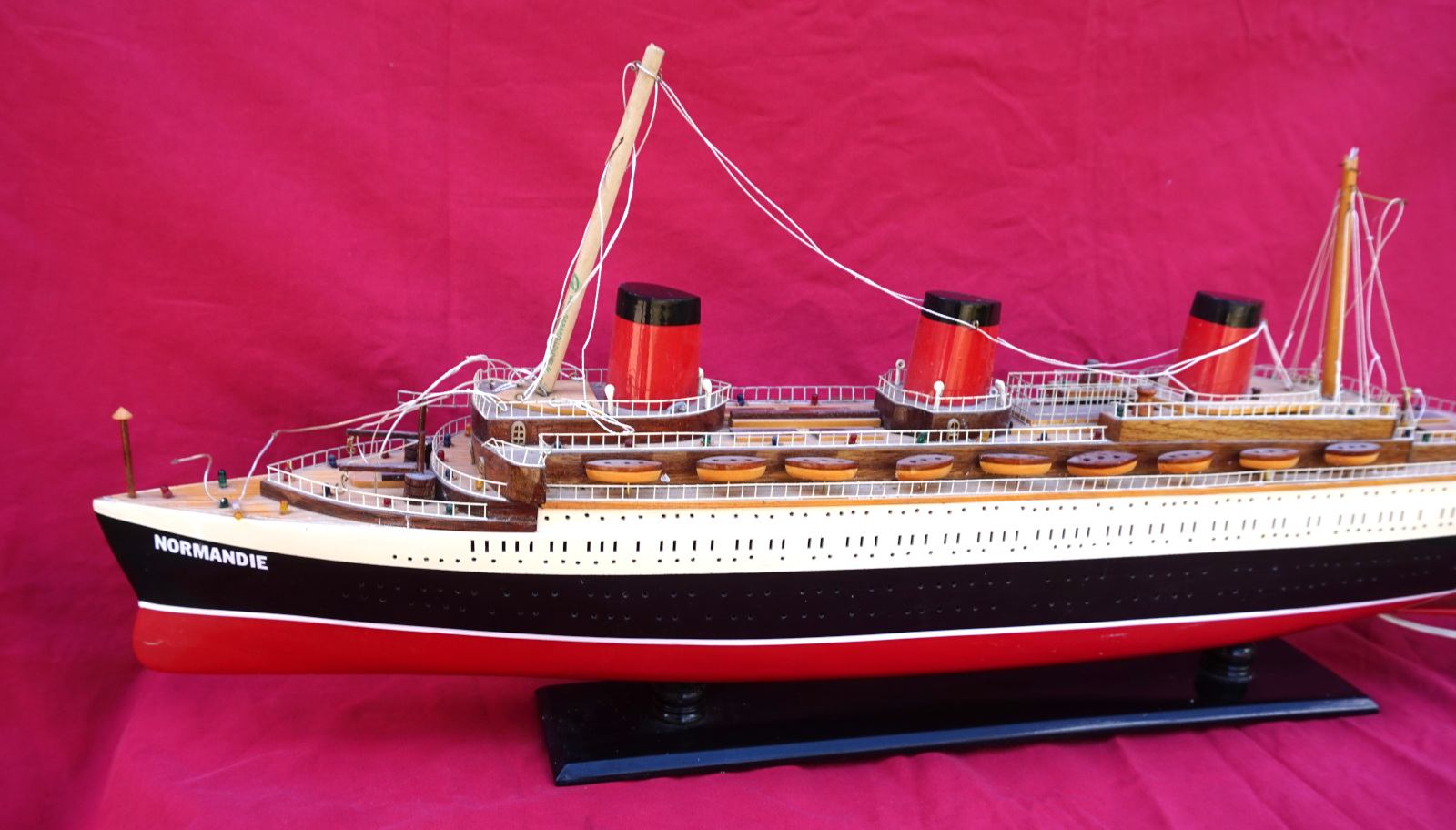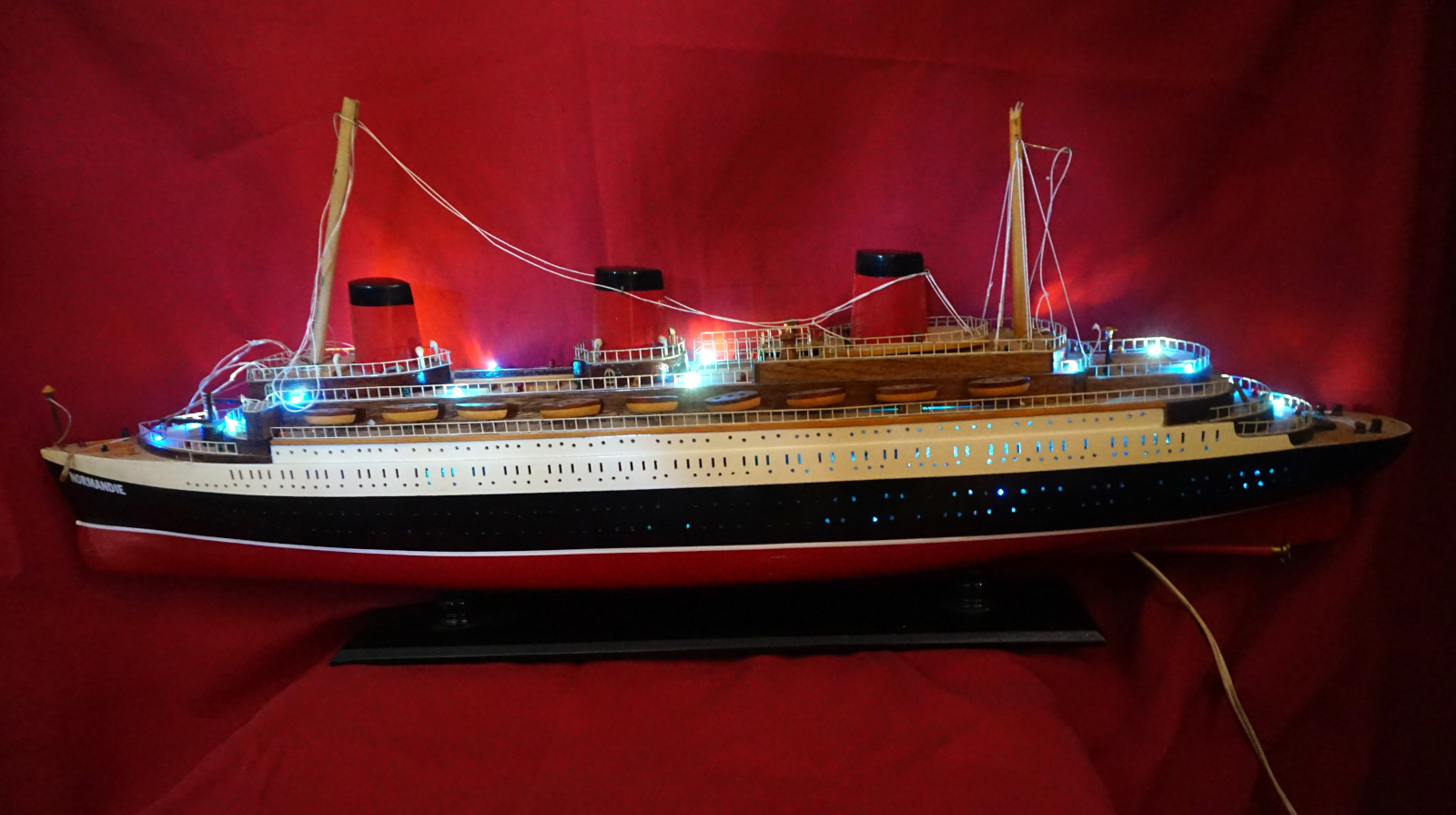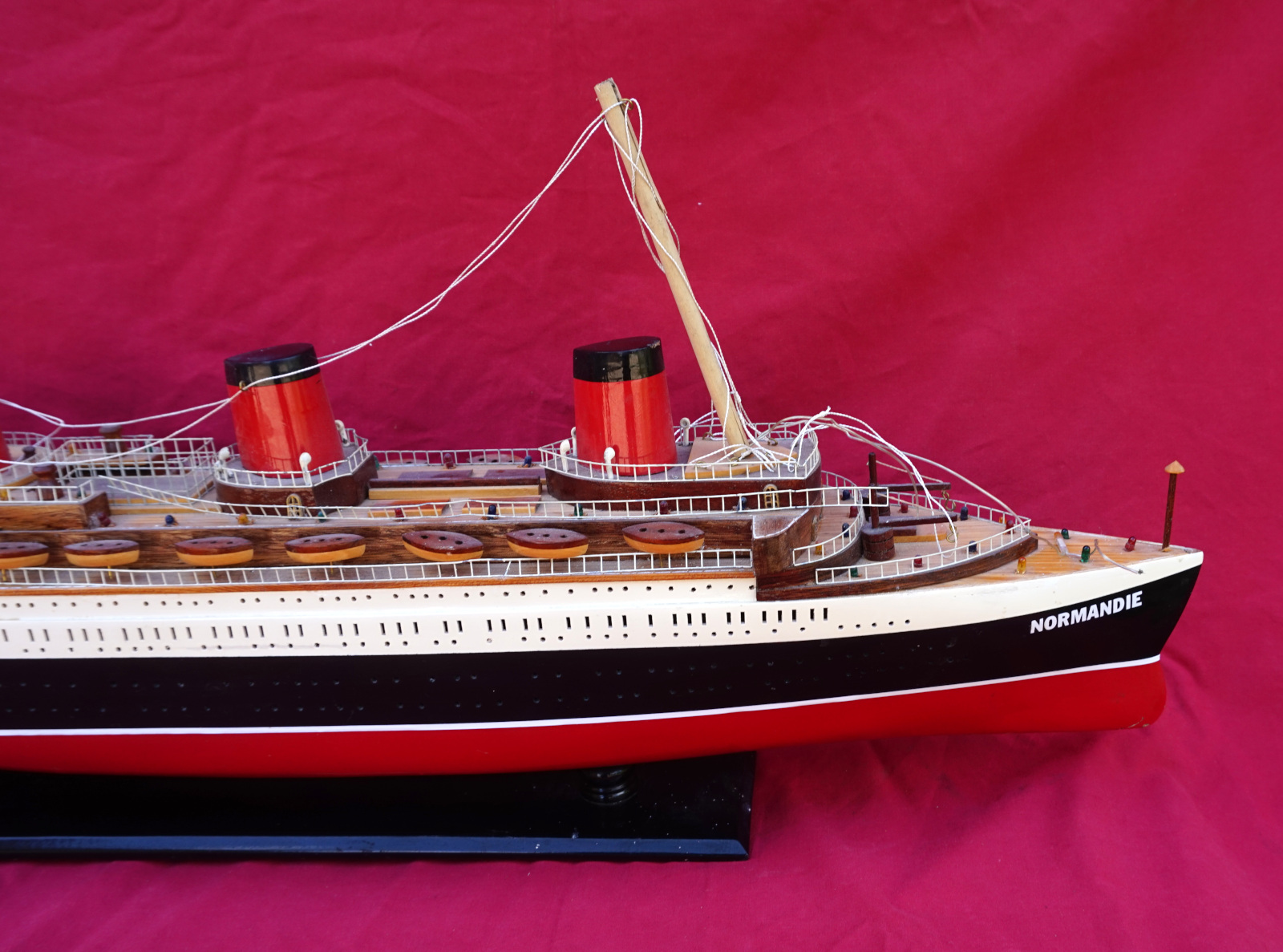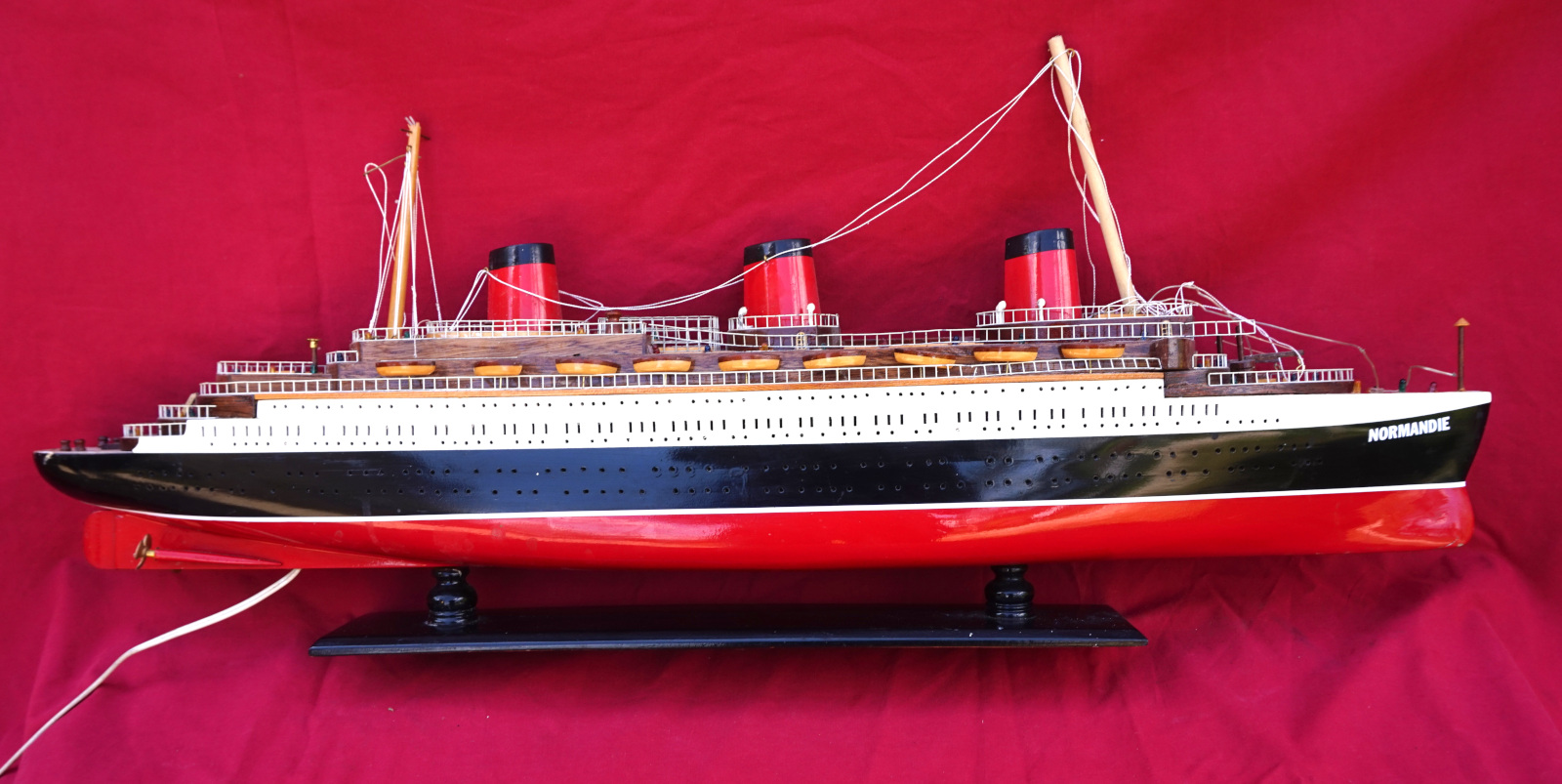 Maquette en bois du paquebot Normandie echelle 1/350, avec éclairage. Longueur 82 cm, largeur 11 cm, hauteur hors tout 32.5 cm, hauteur de la coque aux chaminées 18 cm, poids 1.538 kg. Bel état, quelques petites réparations à prévoir.