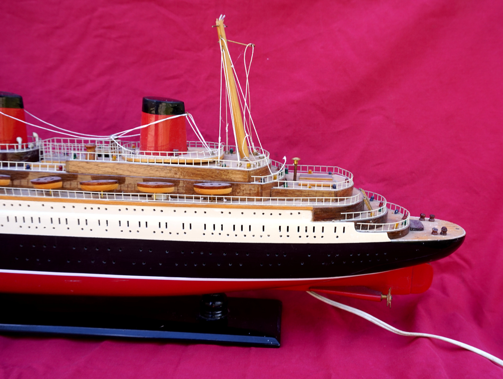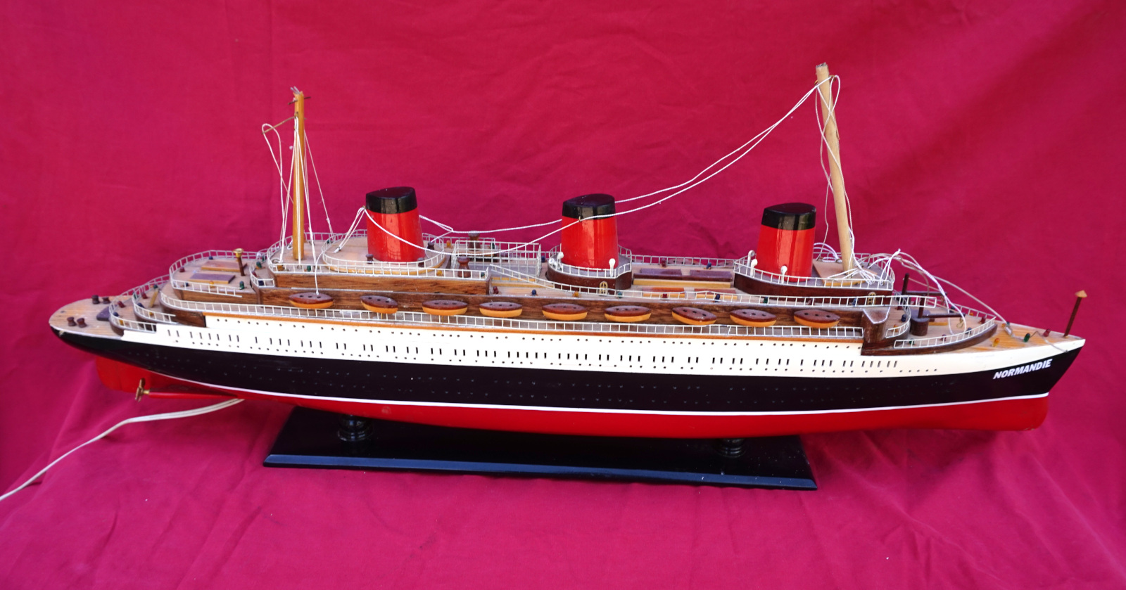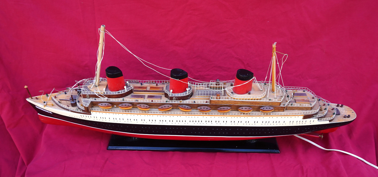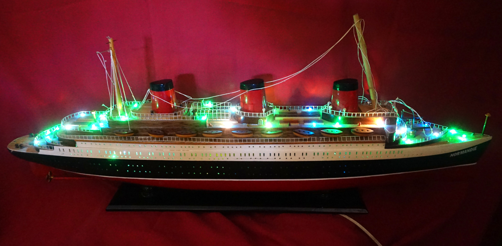 Maquette en bois du paquebot Normandie echelle 1/350, avec éclairage. Longueur 82 cm, largeur 11 cm, hauteur hors tout 32.5 cm, hauteur de la coque aux chaminées 18 cm, poids 1.538 kg. Bel état, quelques petites réparations à prévoir.