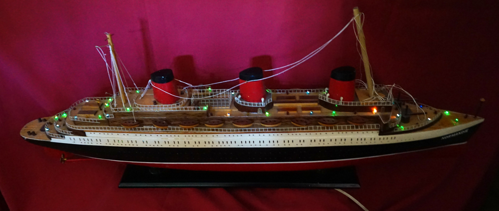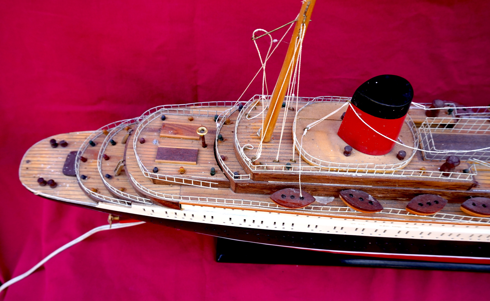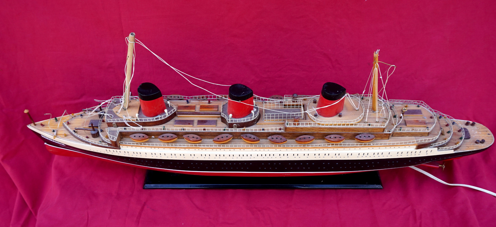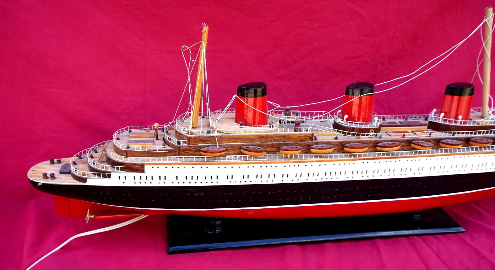 Maquette en bois du paquebot Normandie echelle 1/350, avec éclairage. Longueur 82 cm, largeur 11 cm, hauteur hors tout 32.5 cm, hauteur de la coque aux chaminées 18 cm, poids 1.538 kg. Bel état, quelques petites réparations à prévoir.