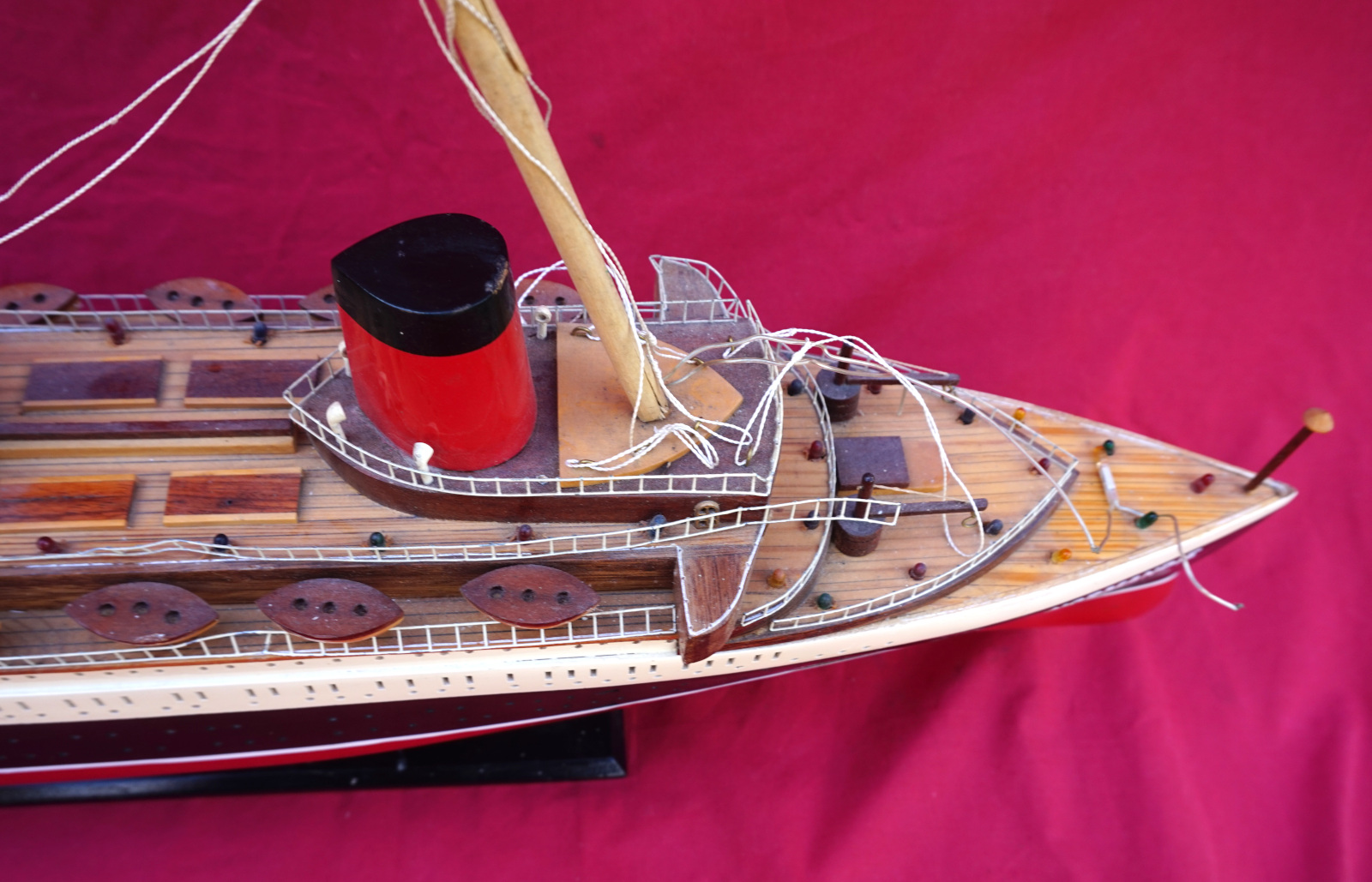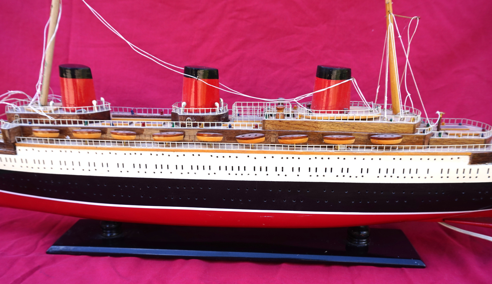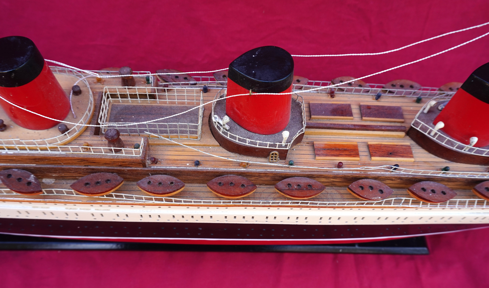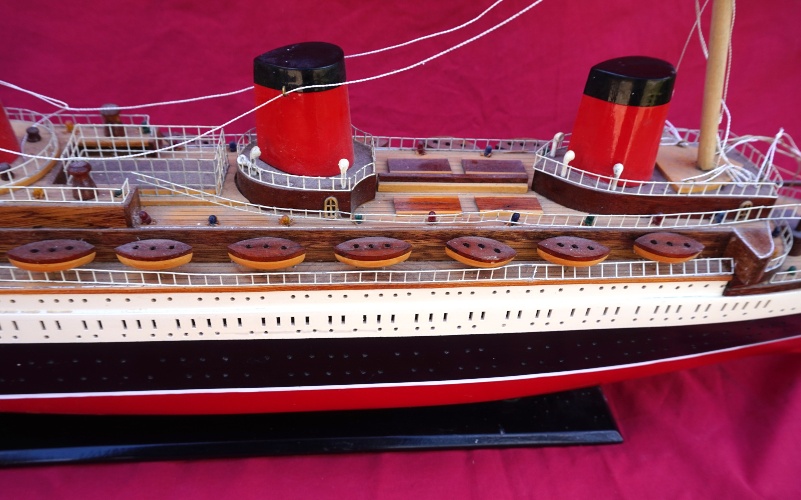 Maquette en bois du paquebot Normandie echelle 1/350, avec éclairage. Longueur 82 cm, largeur 11 cm, hauteur hors tout 32.5 cm, hauteur de la coque aux chaminées 18 cm, poids 1.538 kg. Bel état, quelques petites réparations à prévoir.