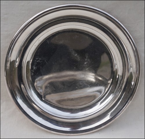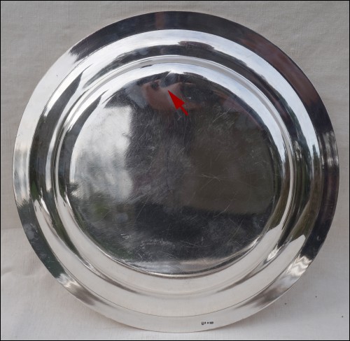 French silverplate large round dish made by SOH in Paris during the middle of the 20th century. It's hallmarked on the bottom. 10 5/8" (27cm) diameter weight 1lb 15.85 oz (903 grams). Good condition a small bump as presented on the following pictures.