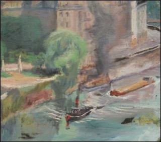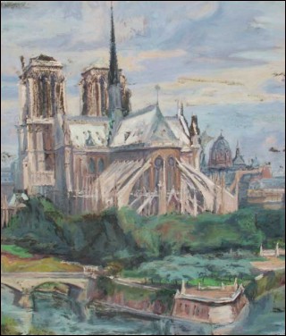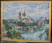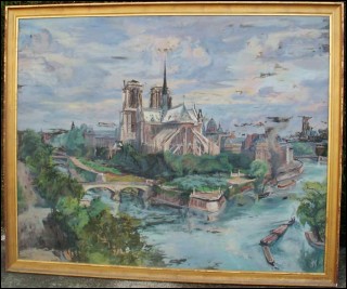 La cathédrale Notre Dame de Paris peinte à l'huile sur toile par André Hébuterne en 1948 pour le paquebot Liberté (décoration des 1ère classe). Très bel état d'origine, document de la vente au dos. Toile format 100F hauteur130 cm, largeur 160 cm, pour le cadre 140cm x 170cm.