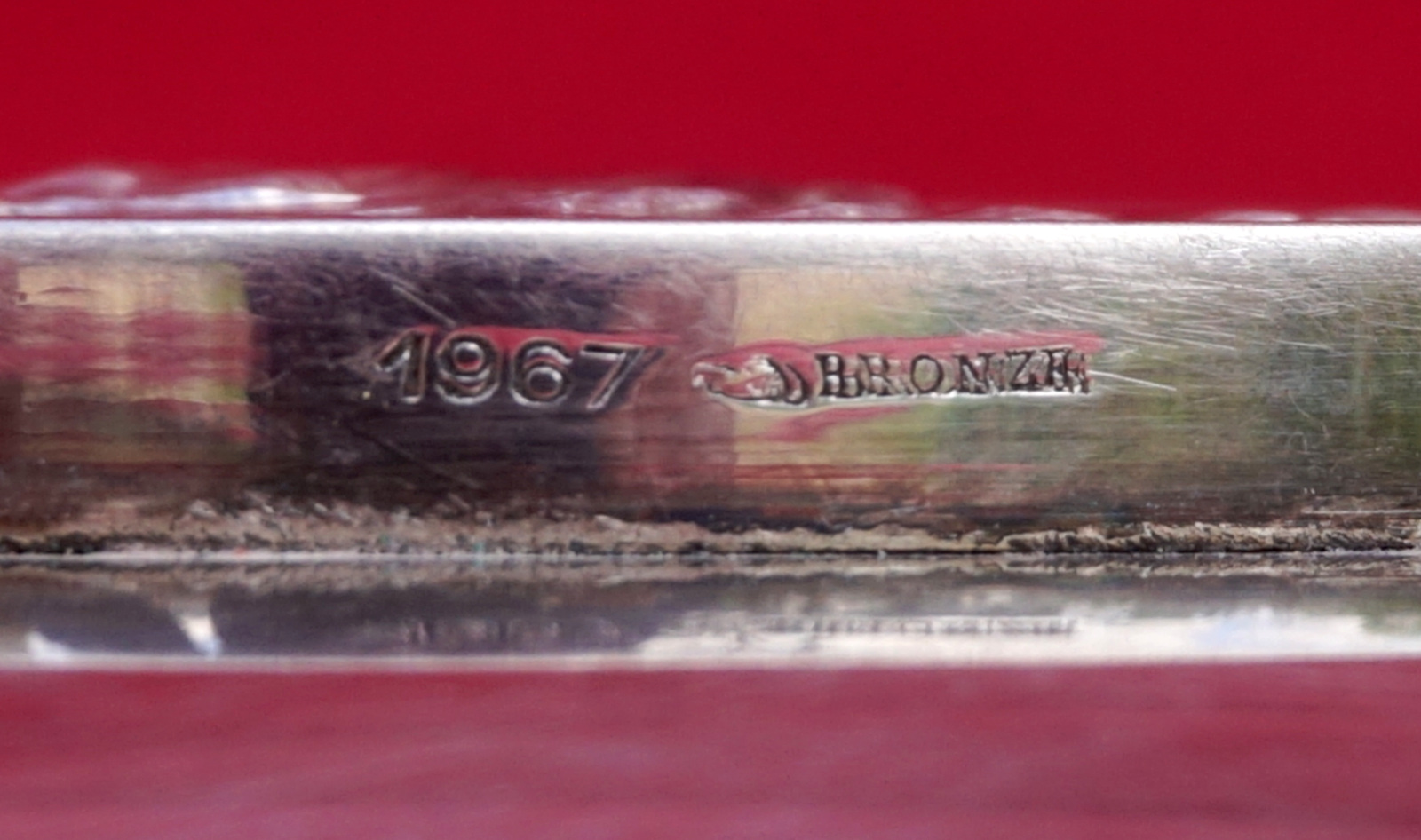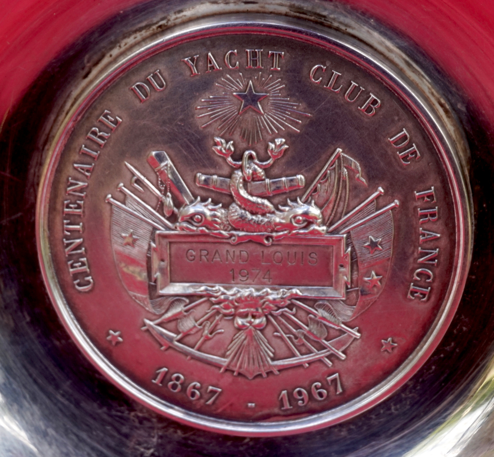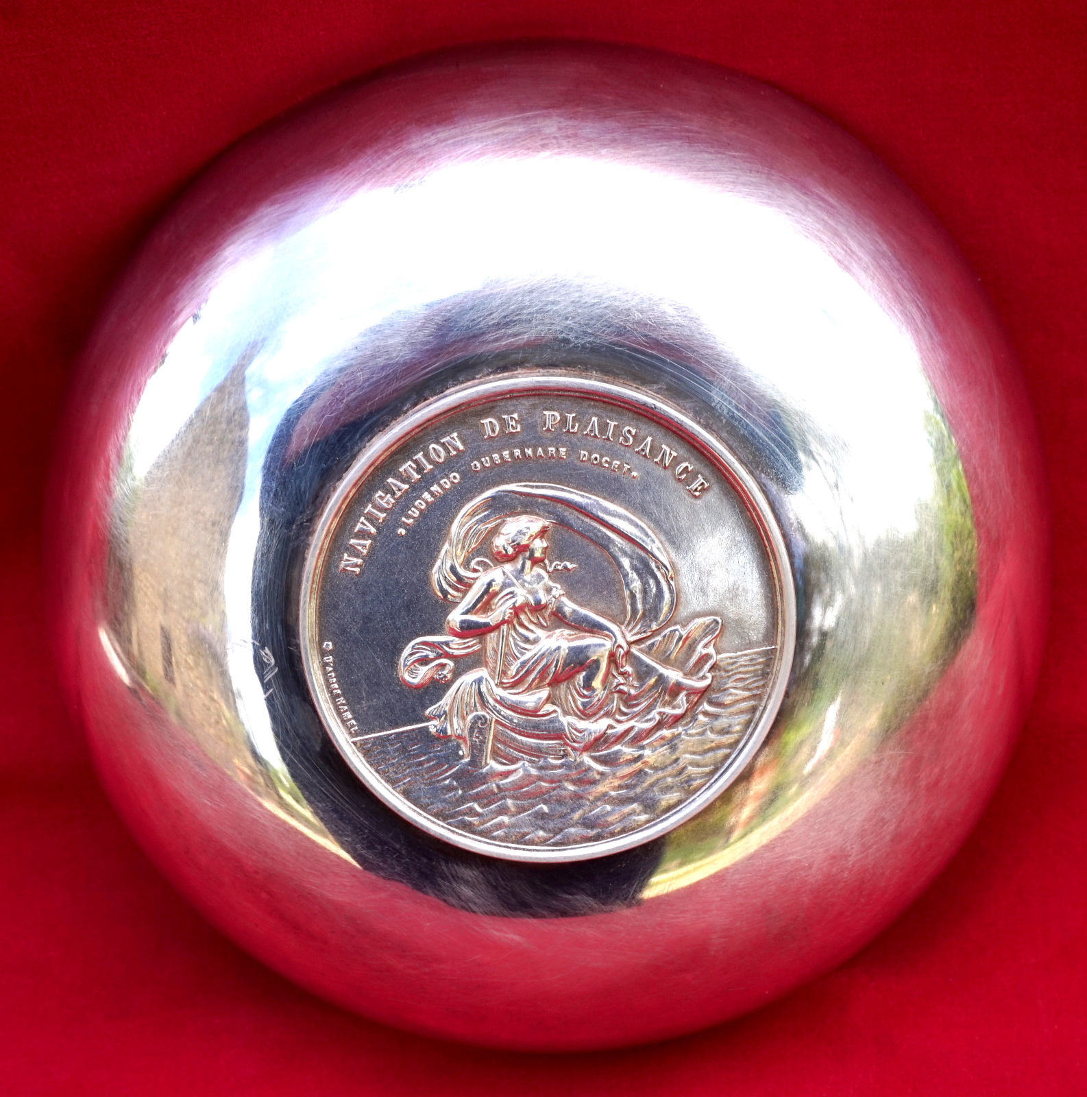 Yacht Club of France centenary (1867-1967) silverplate bronze medal mounted in bowl,engraved Grand Louis 1974, from the work of Hamel . It's hallmaked and dated 1967 bronze with horn. 2" (5.1cm) medal diamter, for the cup :4 1/2( 11.3cm) diameter, 1 1/4" (3.2cm) height, weight 7.97oz (226 grams). Perfect condition.