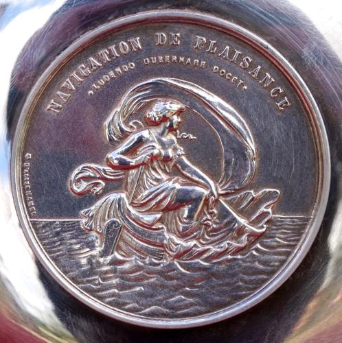 Médaille en bronze argenté, monté en coupe, pour le centenaire du Yacht Club de France (1867-1967), attribué à Louis Grand 1974, d'après Hamel. Diamètre de la médaille 5 cm, pour la coupe : diamètre 11.3 cm, hauteur 3.2 cm. Estampillé 1967 "corne" bronze (Monnaie de Paris). Très bel état.