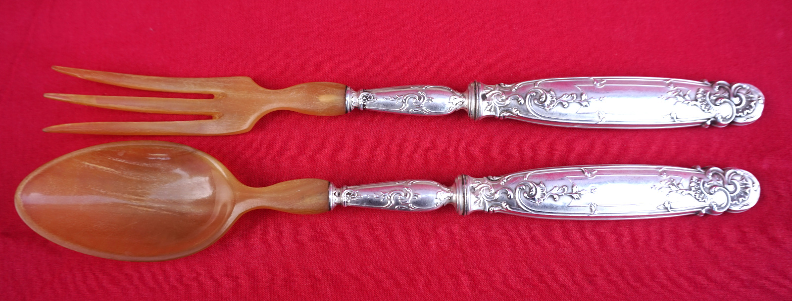 Salad Serving Set Horn Sterling Silver Louis XV Boxed 1900's