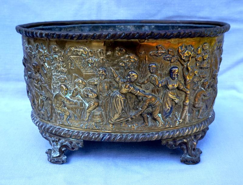 Repousse Brass Oval Jardiniere Flower Pot Villagers Tavern Zinc Container 1880's