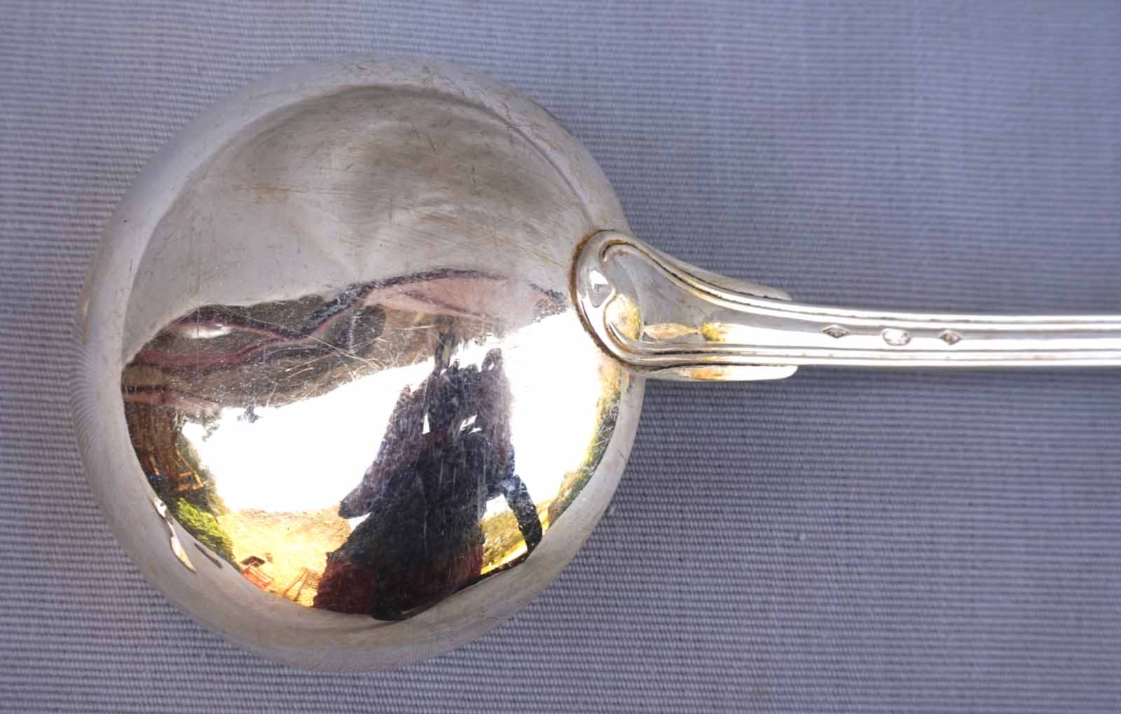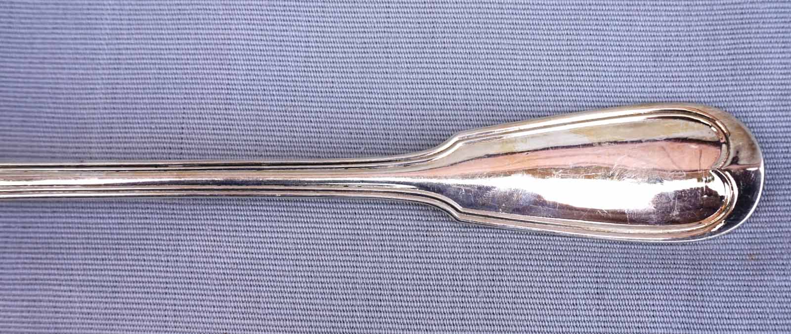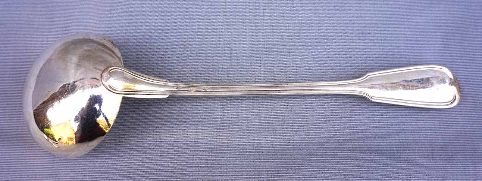 Louche en métal argenté modèle au filet Chinon par Alfénide Christofle milieu XIX° siècle. Elle est estampillée au dos. Longueur 32 cm, diamètre 9.2 cm. Très bel état.