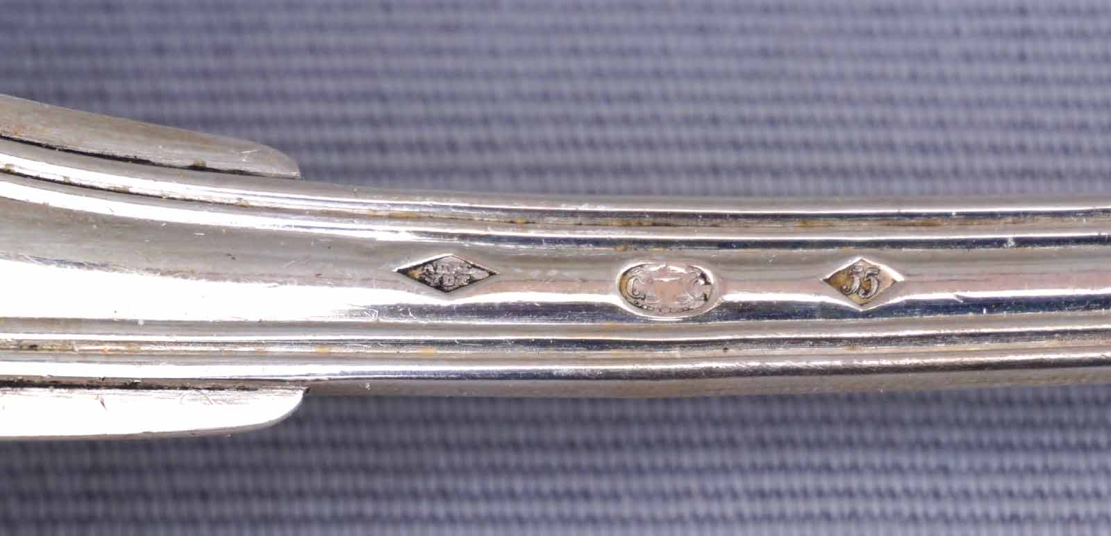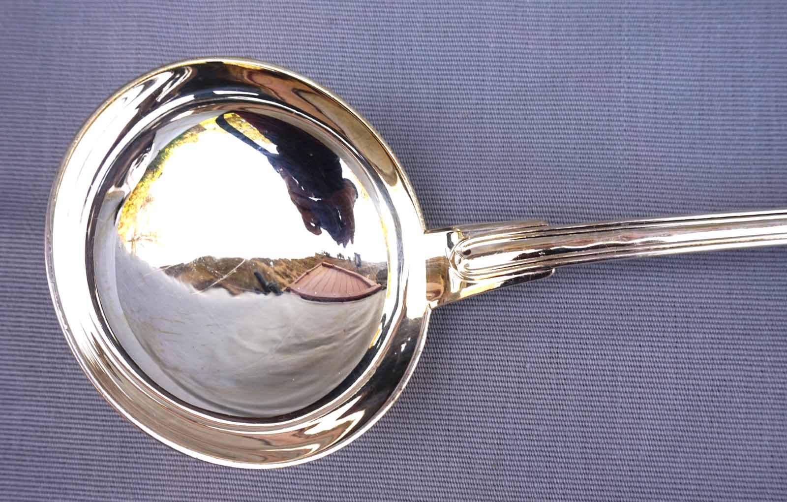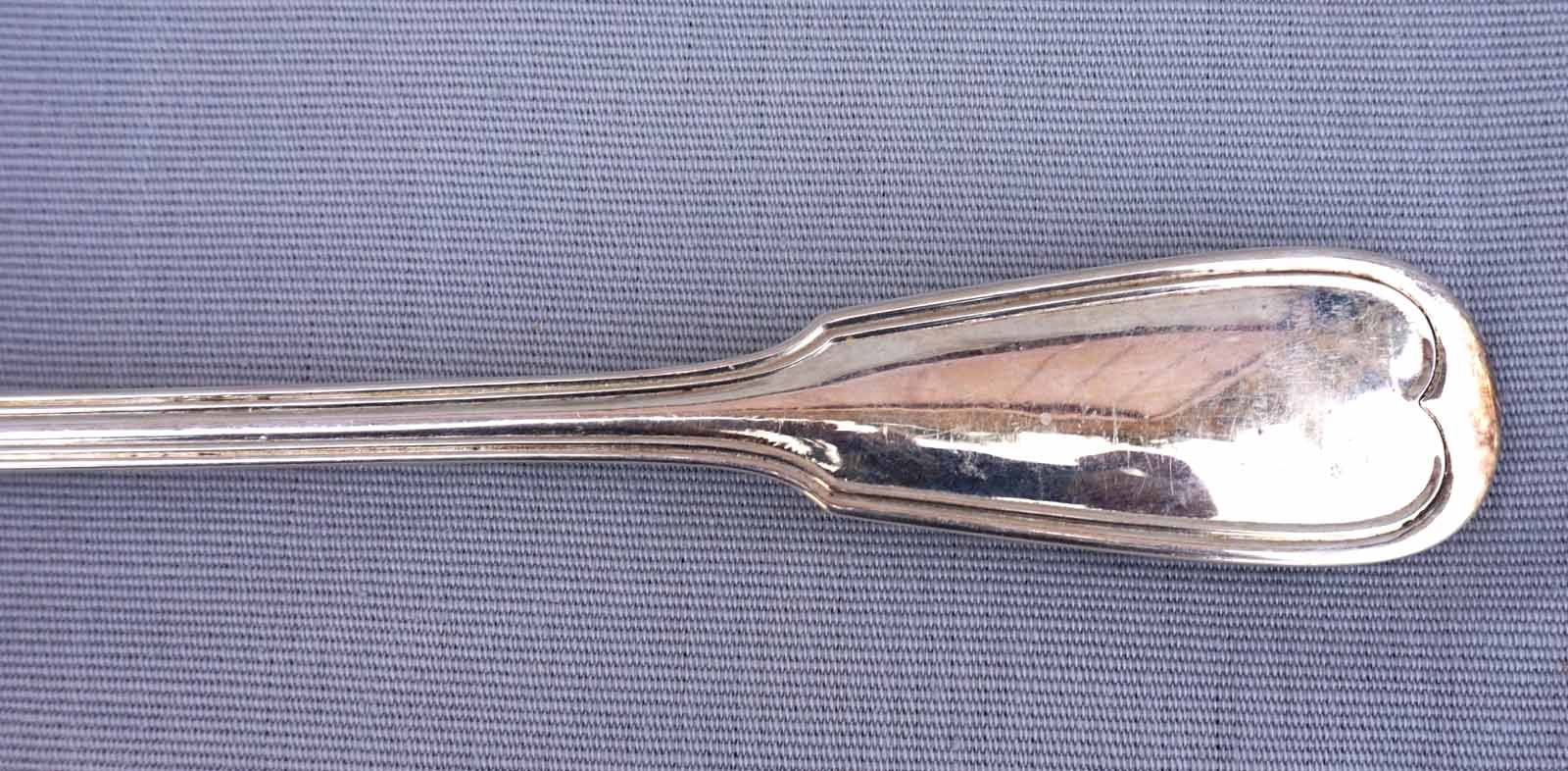 Louche en métal argenté modèle au filet Chinon par Alfénide Christofle milieu XIX° siècle. Elle est estampillée au dos. Longueur 32 cm, diamètre 9.2 cm. Très bel état.