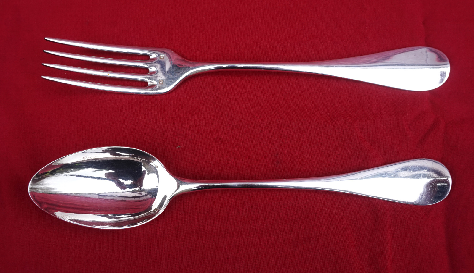 French nickel silver pair of fork and spoon with Sc monogram in medallion made by Alfenide during the 1920's. They are hallmarked. 7 1/4" (18.3cm) length. Perfect condition.