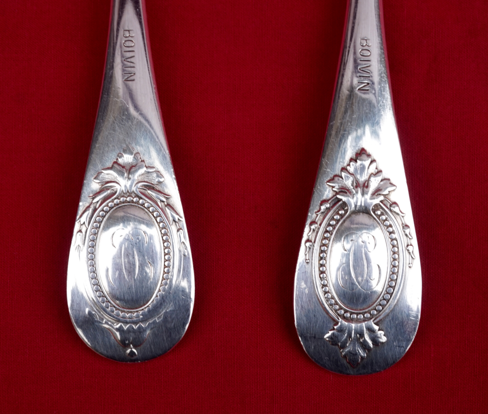 Paire de couverts de baptême, monogramme Sc gravé Boivin par Alfénide, vers 1920. Ils sont poinçonnés. Longueur 18.3 cm. Très bel état.