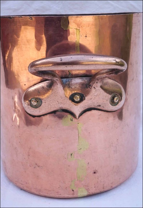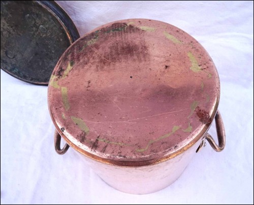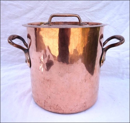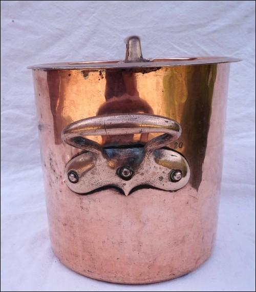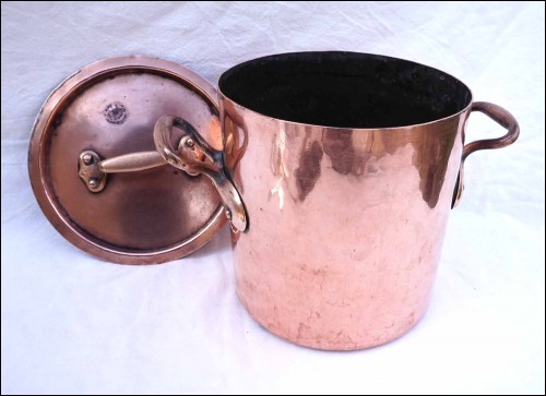 Fait-tout à couvercle en cuivre étamé, martelé, monté à queues d'arondes, début XIXe siècle. Numéroté 20. Hauteur 21 cm, diamètre 20 cm, largeur avec les anses 31 cm, poids 3.510 kg. Très bel état.