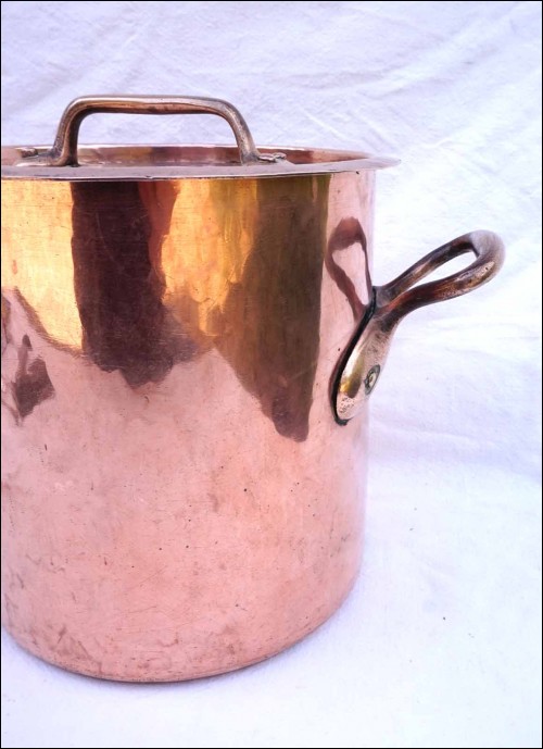 French cookware dovetailed hammered tined copper stock pot with lid made early 19th century. It's stamped 20. 8 1/4" (21cm) height, 7 7/8" (20cm) diameter, 121/4" (31cm) width with handles, weight 7lb 11.81oz (3.510 kilograms). Beautiful condition as shown by the following pictures.
