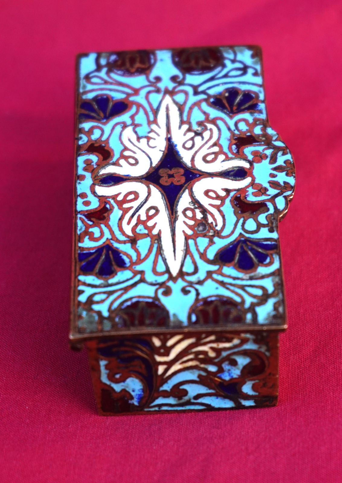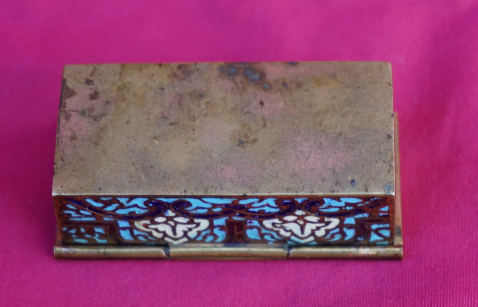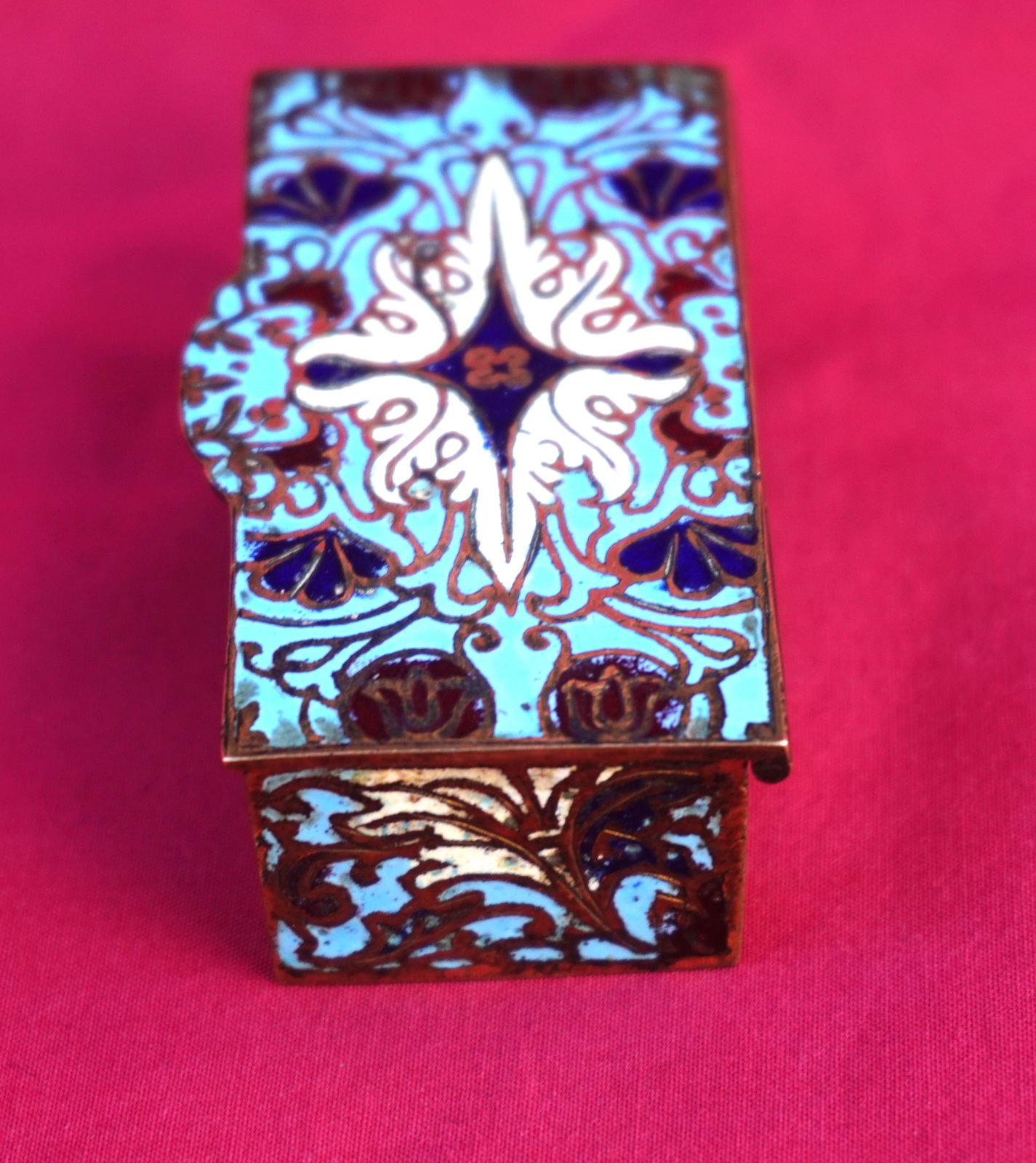 Boite à timbres en email champlevé vers 1890. Longueur 7.2 cm, largeur 3.7 cm, hauteur 2.4 cm. Très bel état.