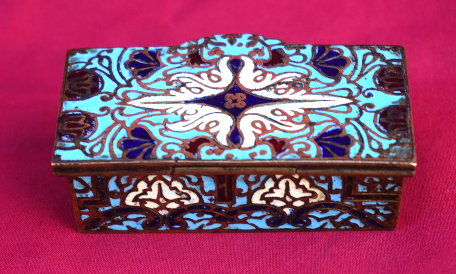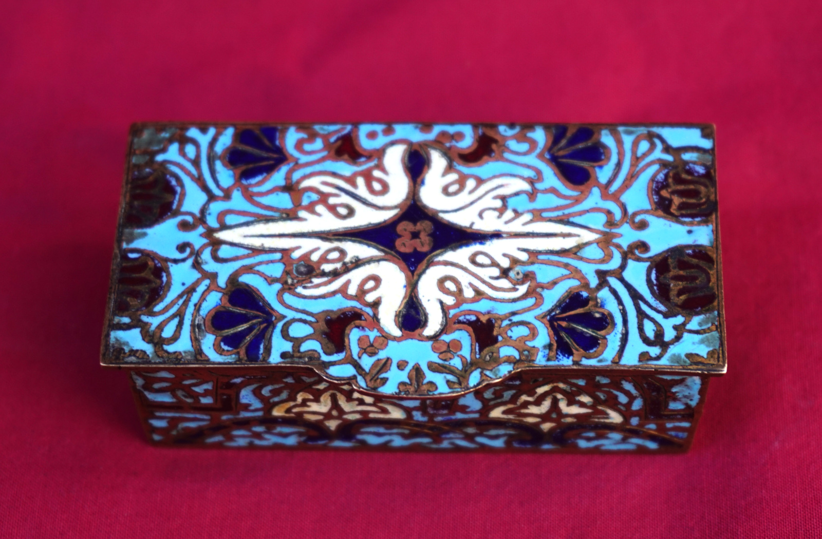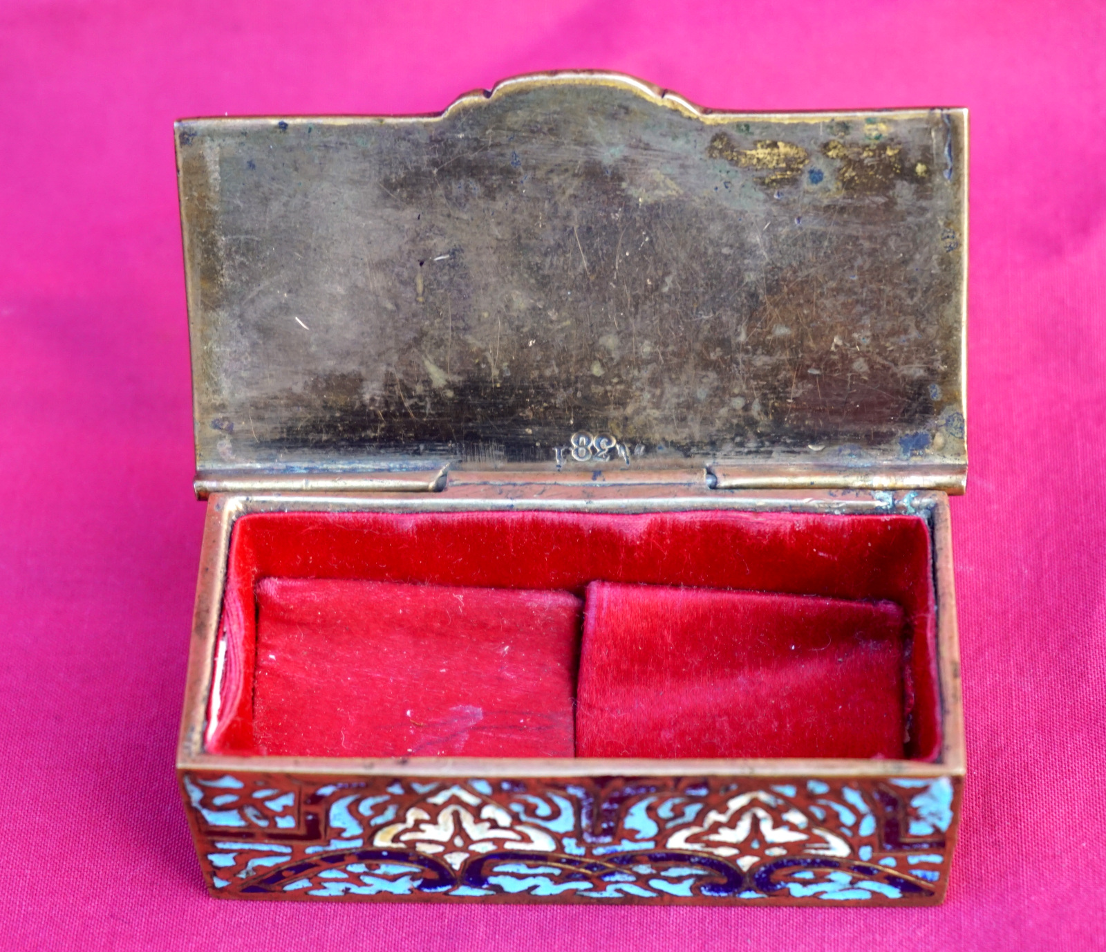 Boite à timbres en email champlevé vers 1890. Longueur 7.2 cm, largeur 3.7 cm, hauteur 2.4 cm. Très bel état.