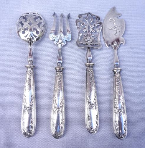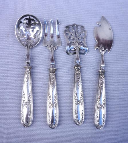 Hors d'oeuvre, cocktail serving set with hollow sterling silver handles made late 19 th century. The set of 4 pieces includes: a tuna scoop, a sardine fork, an olive pierced spoon and a ginger fork/knife.They are hallmarked with the head of Minerva, french sterling silver (.925) guarantee and the silversmith mark. Length between 6 1/8" (15.6cm) and 7" (17.7cm). Very good condition with original case, the case is used.