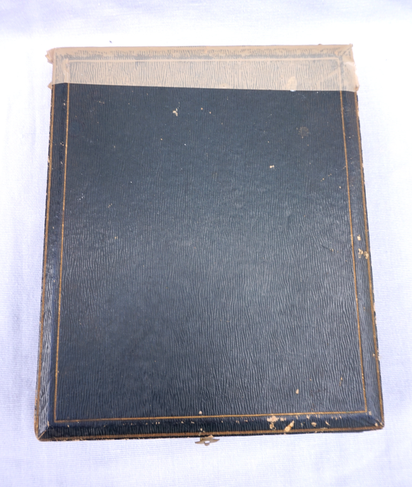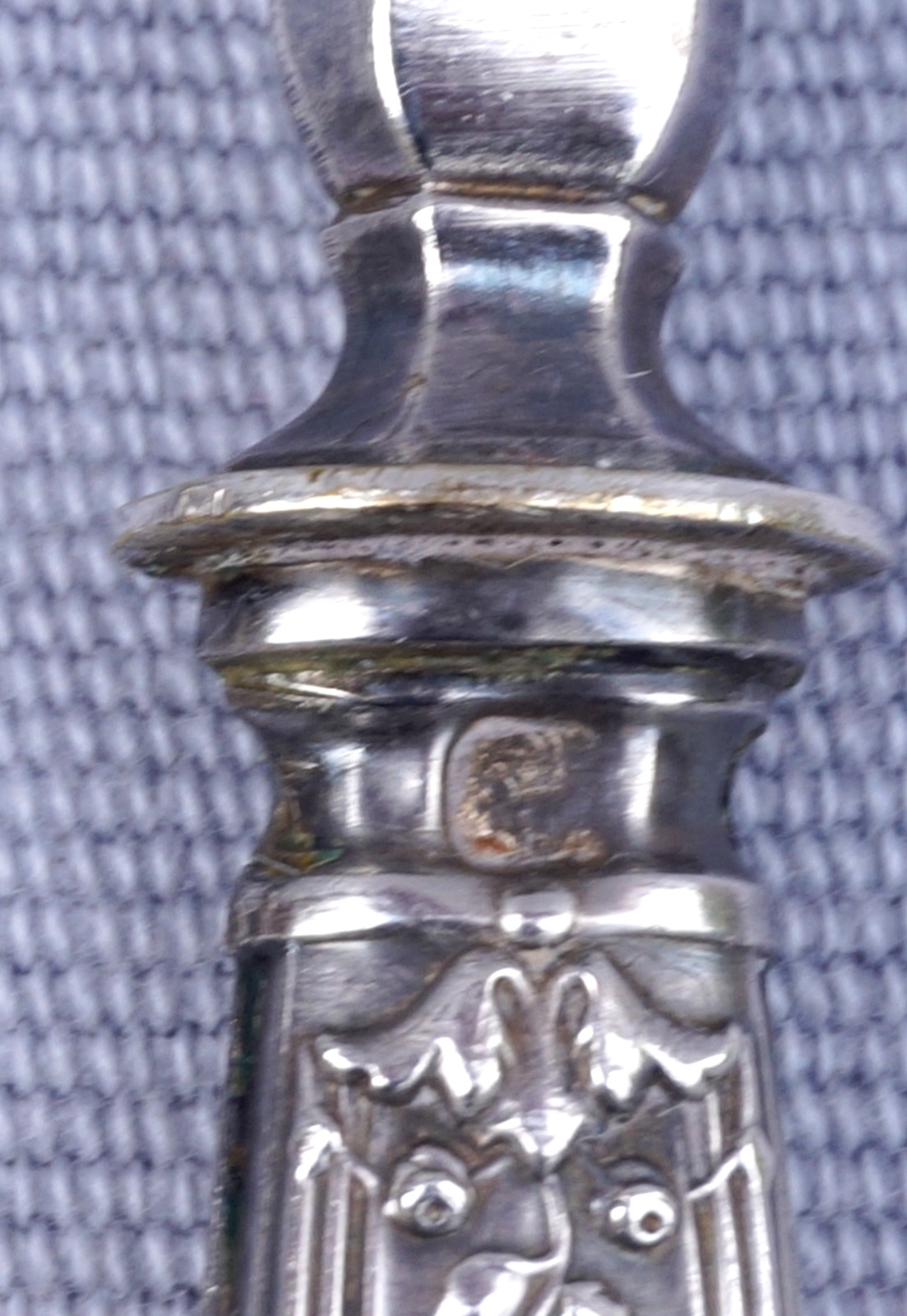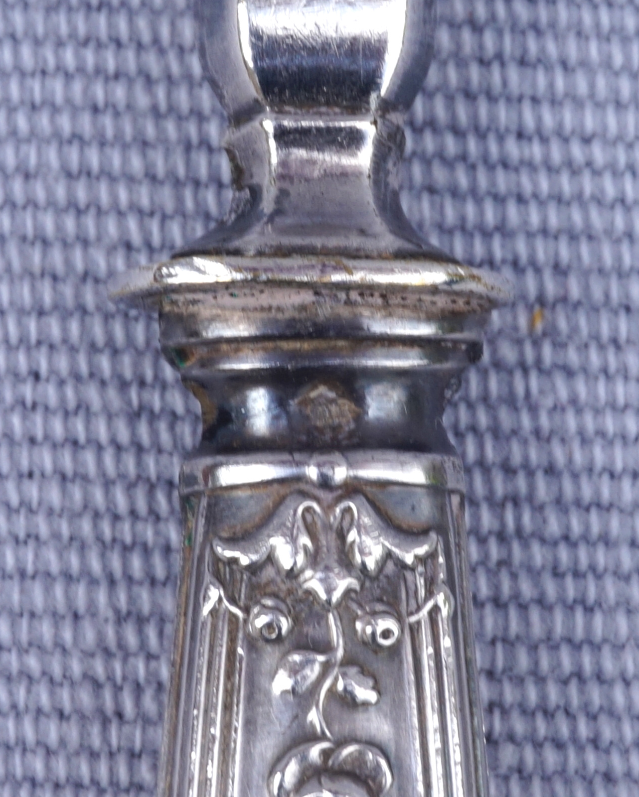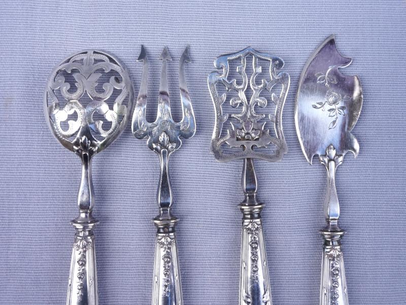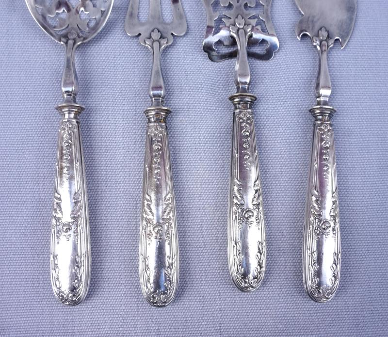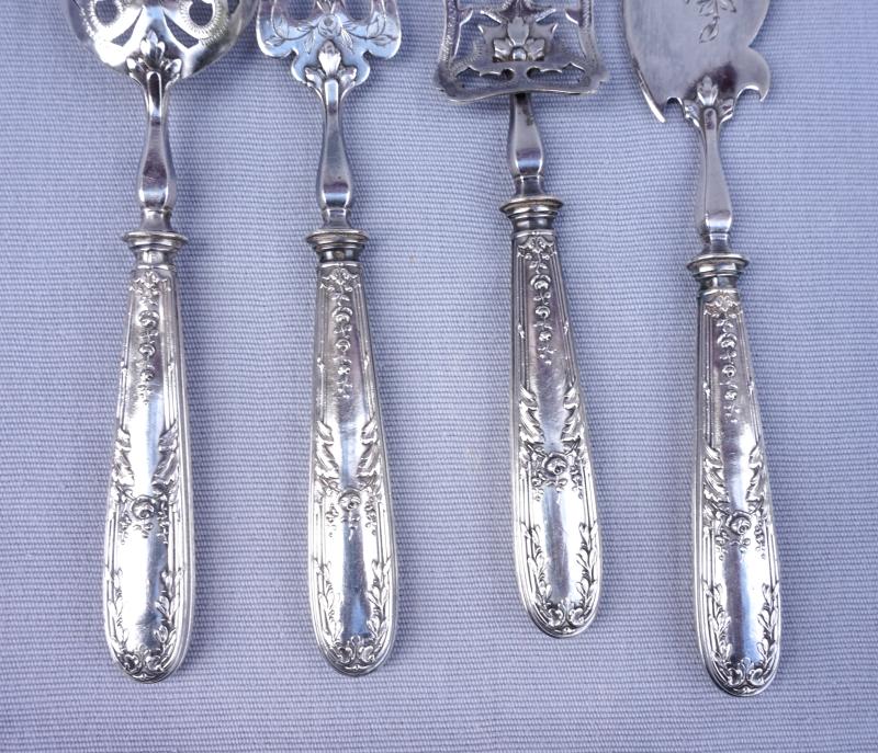 Service à hors d’œuvre manches argent fourré, une pelle à thon, une fourche à sardine, une cuillère à olive et un couteau à gingembre, milieu XIXe siècle. Longueur entre 15.6 cm et 17.7 cm. Poinçon Minerve et orfèvre. Bel état, peu d'usage, l'écrin est abimé.