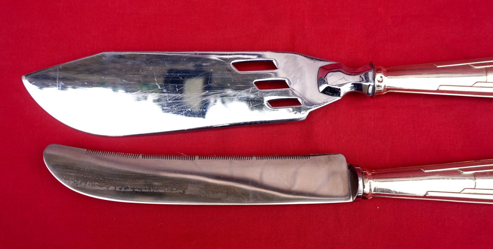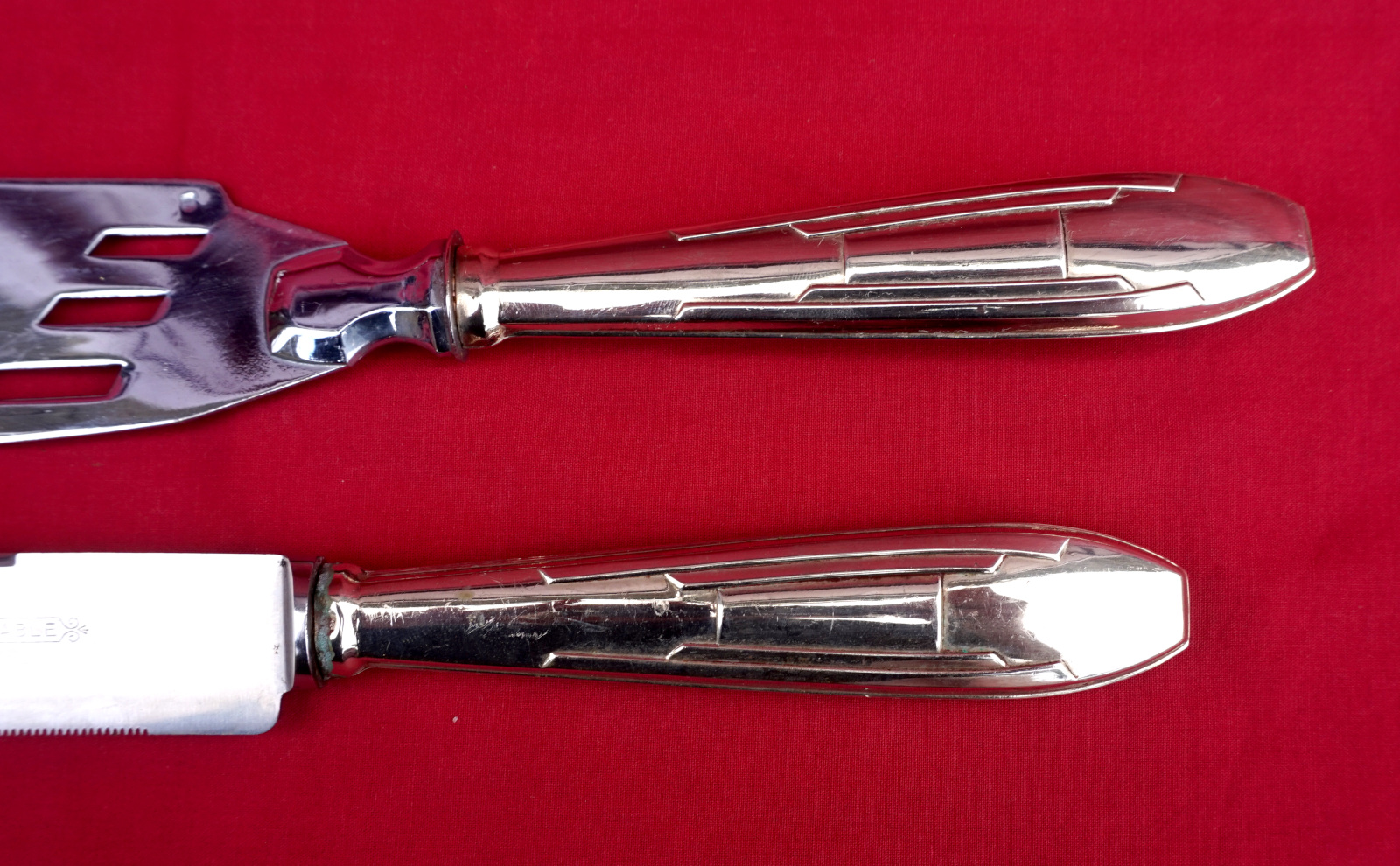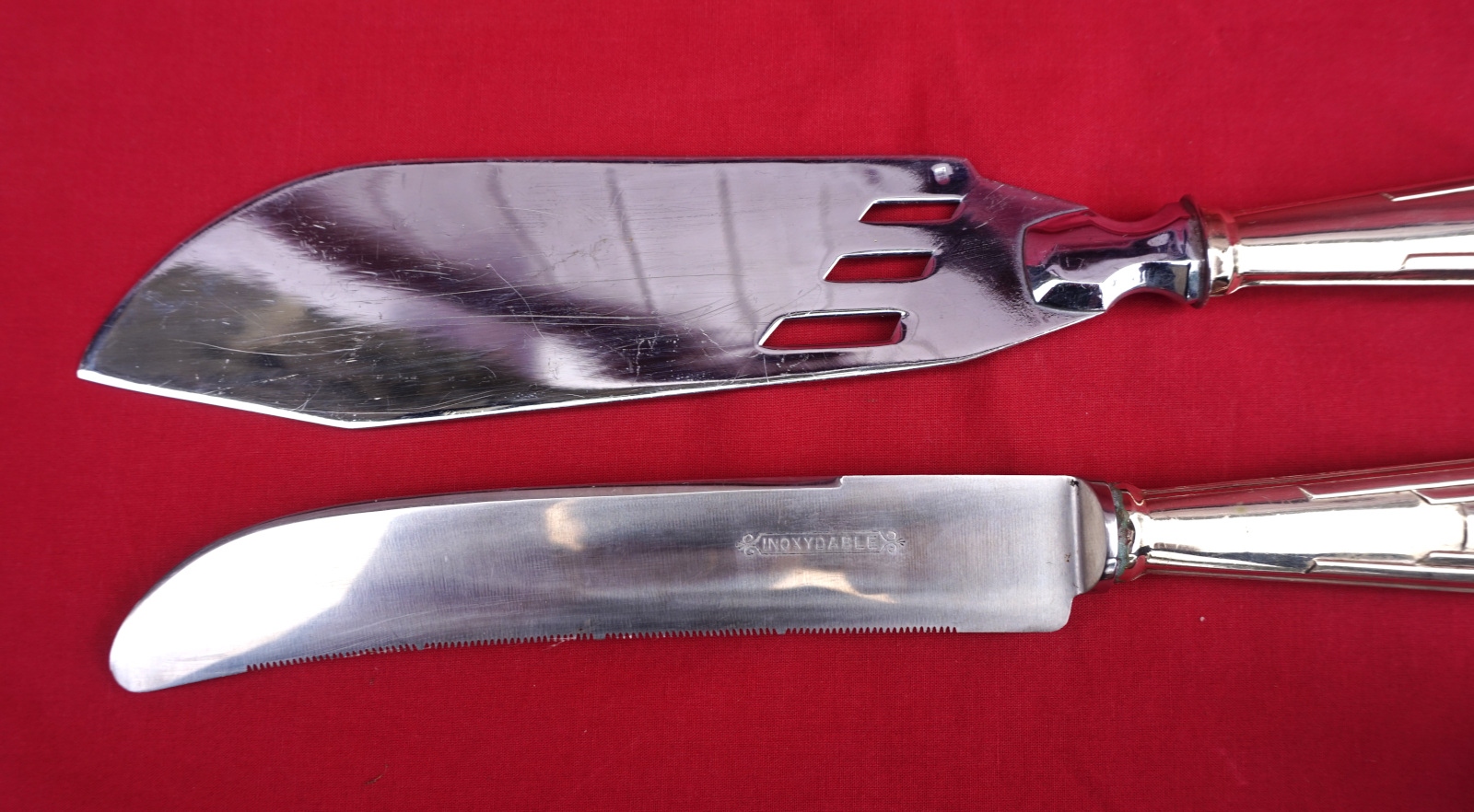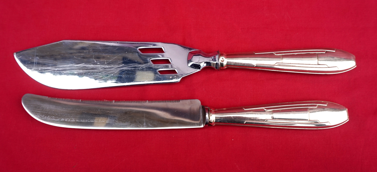 French art Deco bread knife, stainless steel blade, and pie cake server set made during the 1930's. They are hallmarked. 10 1/4" (26.2cm) length for the bread knife and 11 1/2" (29.2cm) for the pie cake server. Perfect condition.